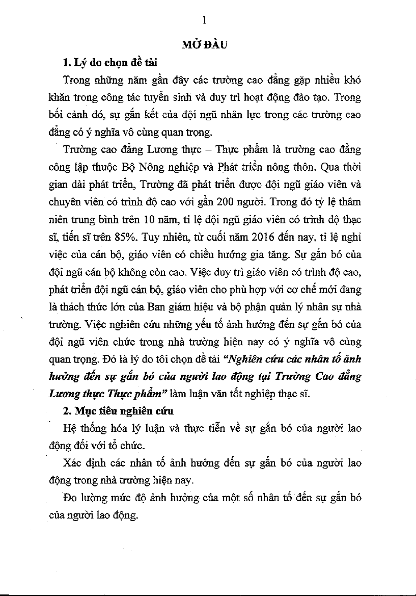 Tóm tắt luận văn Thạc sĩ Quản trị kinh doanh: Nghiên cứu các nhân tố ảnh hưởng đến sự gắn bó của người lao động tại Trường Cao đẳng Lương thực - Thực phẩm