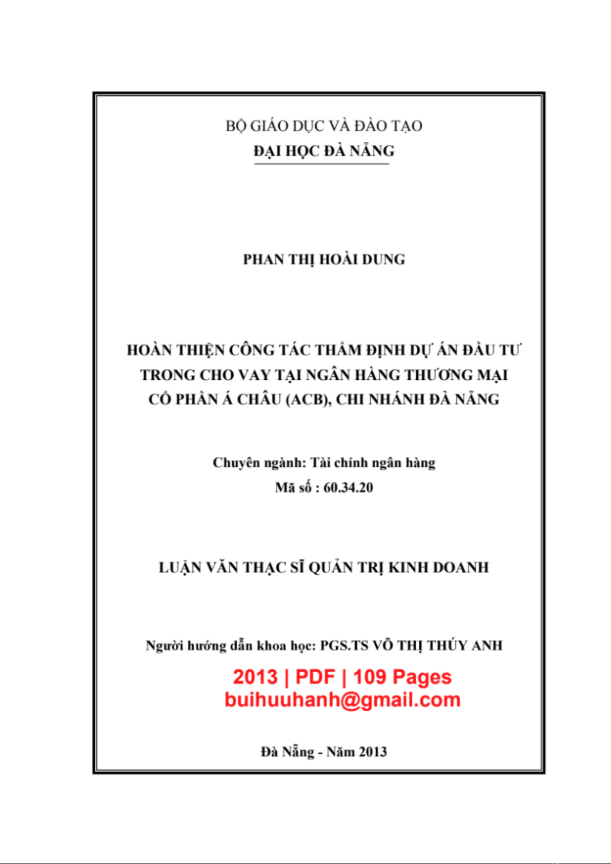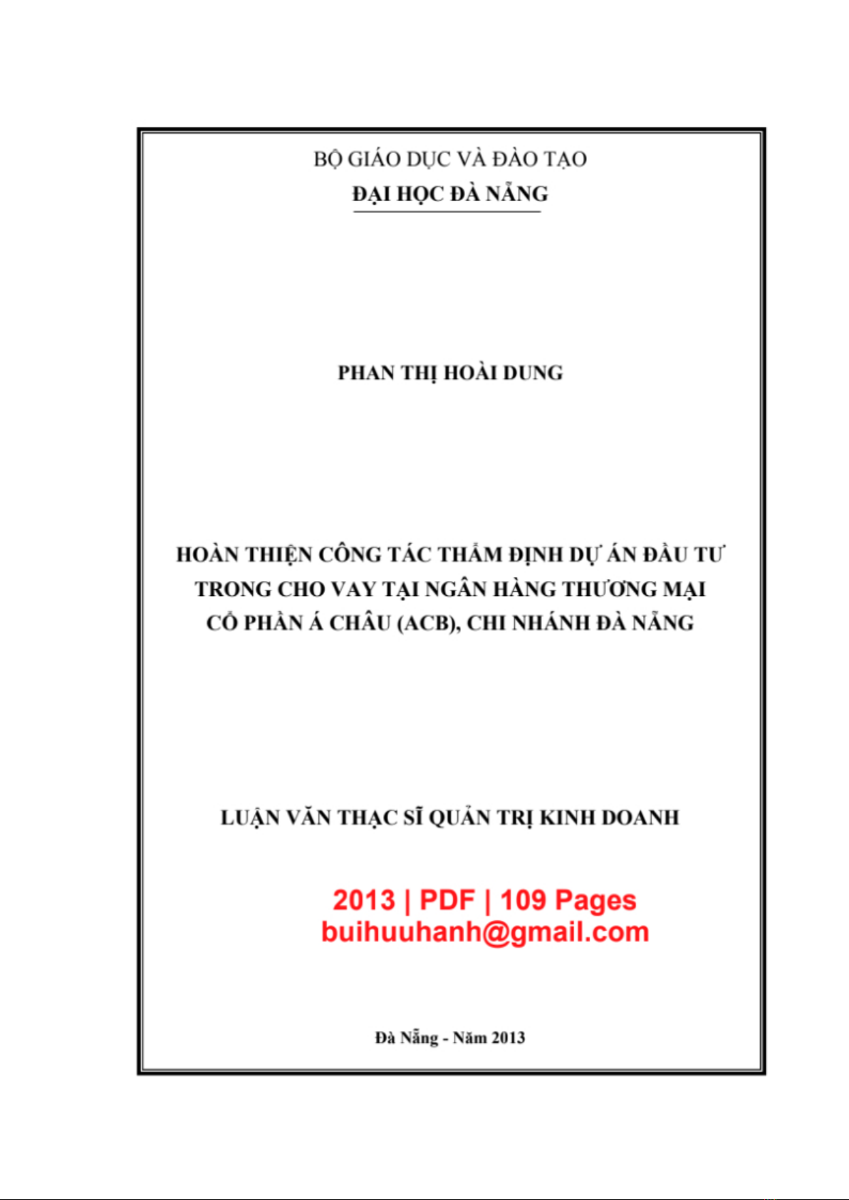 Luận văn Thạc sĩ Quản trị kinh doanh: Hoàn thiện công tác thẩm định dự án đầu tư trong cho vay tại Ngân hàng TMCP Á Châu (ACB), chi nhánh Đà Nẵng là một nghiên cứu khoa học về quản trị kinh doanh, tập trung vào việc hoàn thiện công tác thẩm định tài chính dự án đầu tư trong cho vay tại ngân hàng thương mại. Nghiên cứu này dựa trên cơ sở lý luận về công tác thẩm định tài chính dự án đầu tư, và thực trạng công tác thẩm định tài chính dự án đầu tư tại Ngân hàng TMCP Á Châu (ACB) chi nhánh Đà Nẵng.
