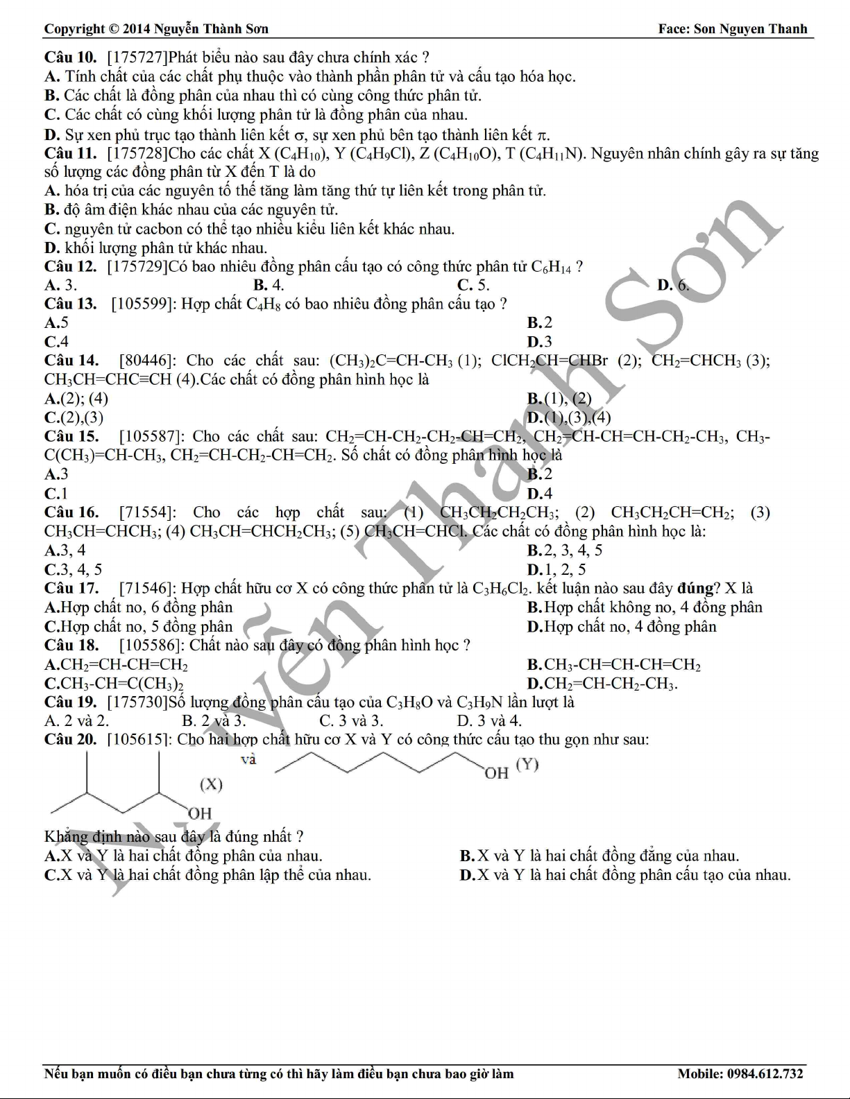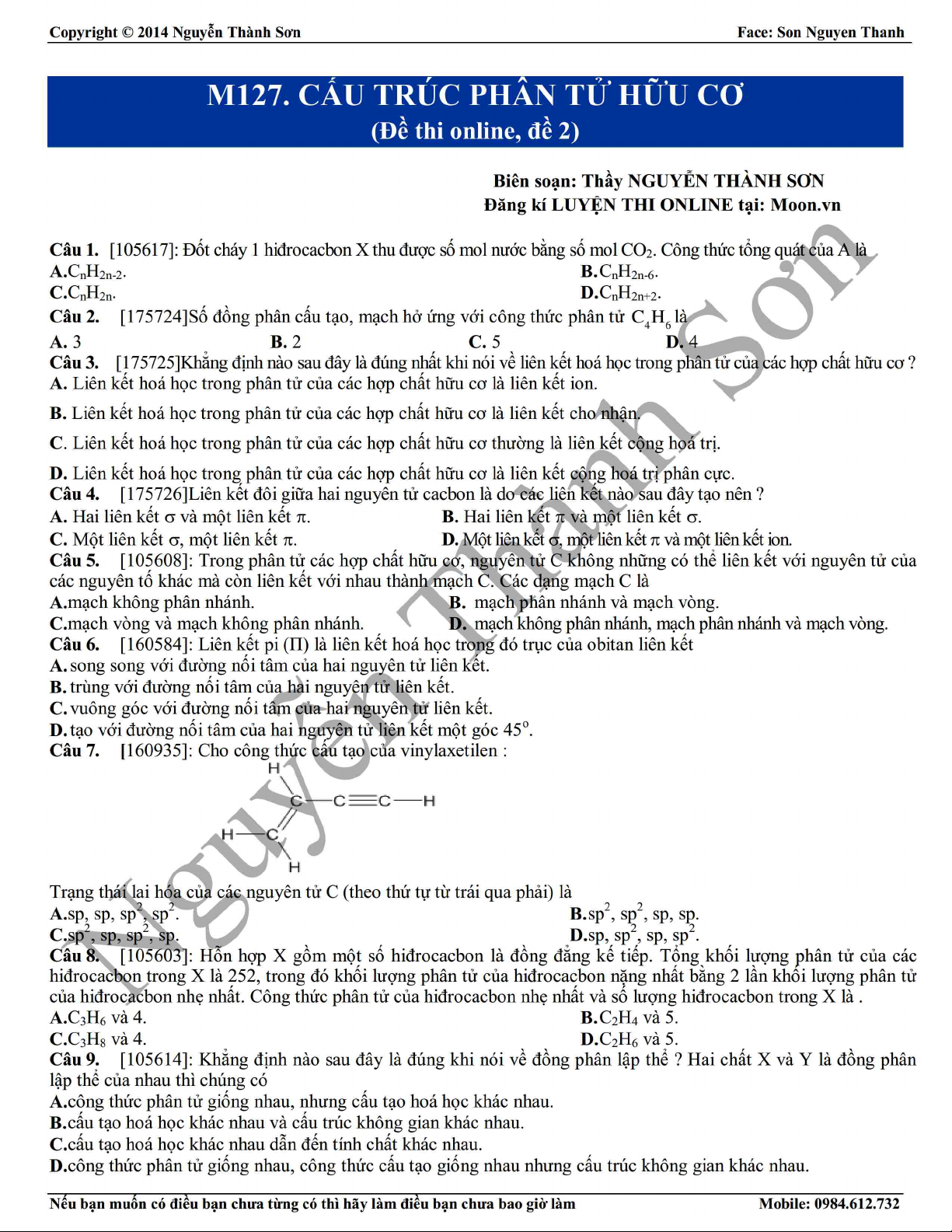 Luyện thi Đại học môn Hóa: Cấu trúc phân tử hợp chất hữu cơ (Đề 2)