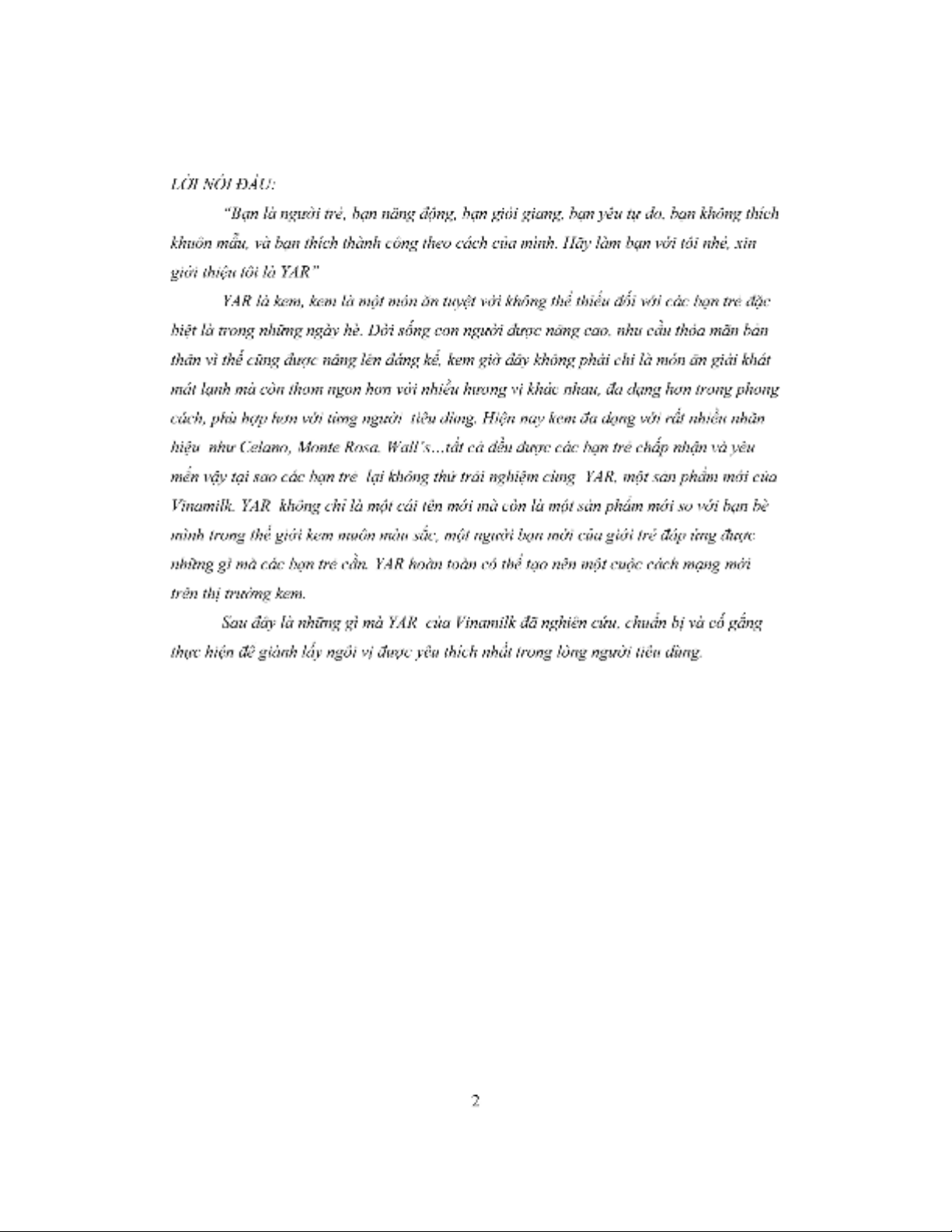 Đề tài Marketing quốc tế: "Kế hoạch phát triển sản phẩm mới kem sữa chua Yar" giới thiệu sơ lược về ngành hàng và lý do chọn, môi trường cạnh tranh, giới thiệu về Vinamilk, phân tích SWOT cho ngành hành kem của Vinamilk, phân khúc và chọn thị trường mục tiêu, hành vi tiêu dùng của khách hàng và nhiều nội dung quan trọng khác.