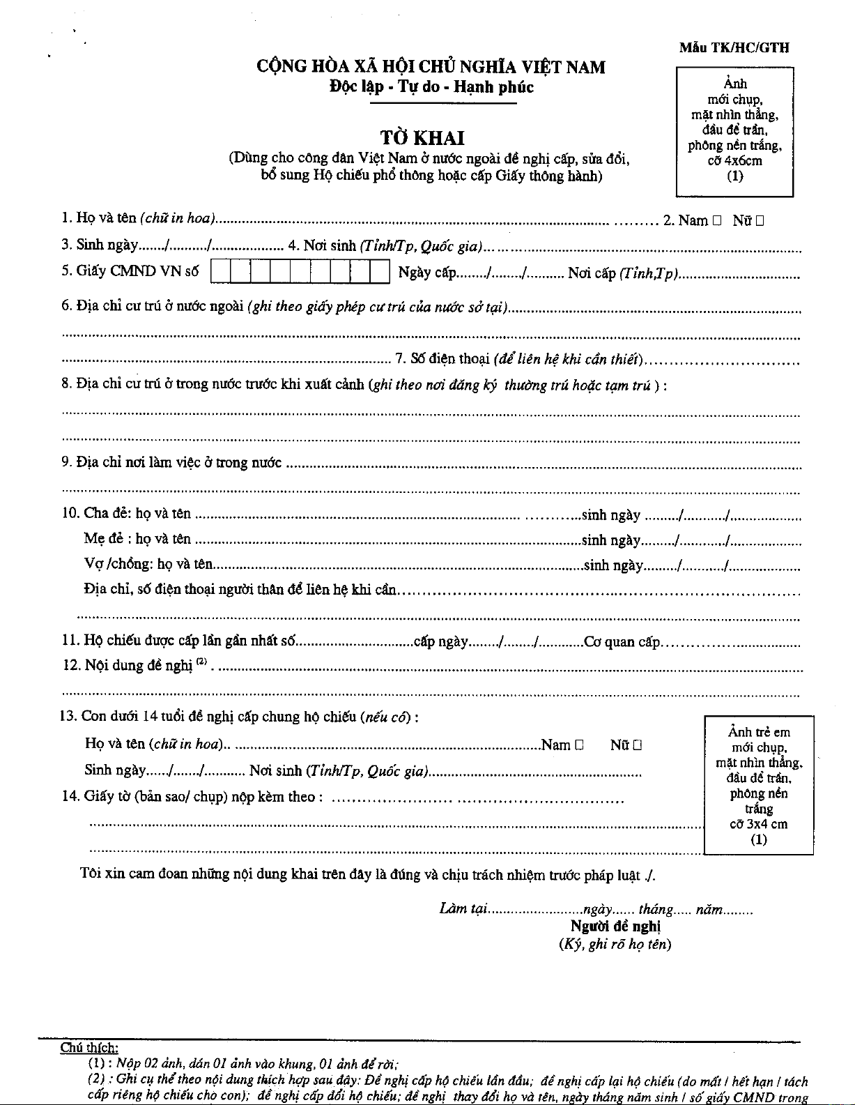 Tài liệu tham khảo Mẫu tờ khai dùng cho công dân Việt Nam ở nước ngoài đề nghị cấp, sửa đổi, bổ sung Hộ chiếu phổ thông hoặc cấp giấy thông hành