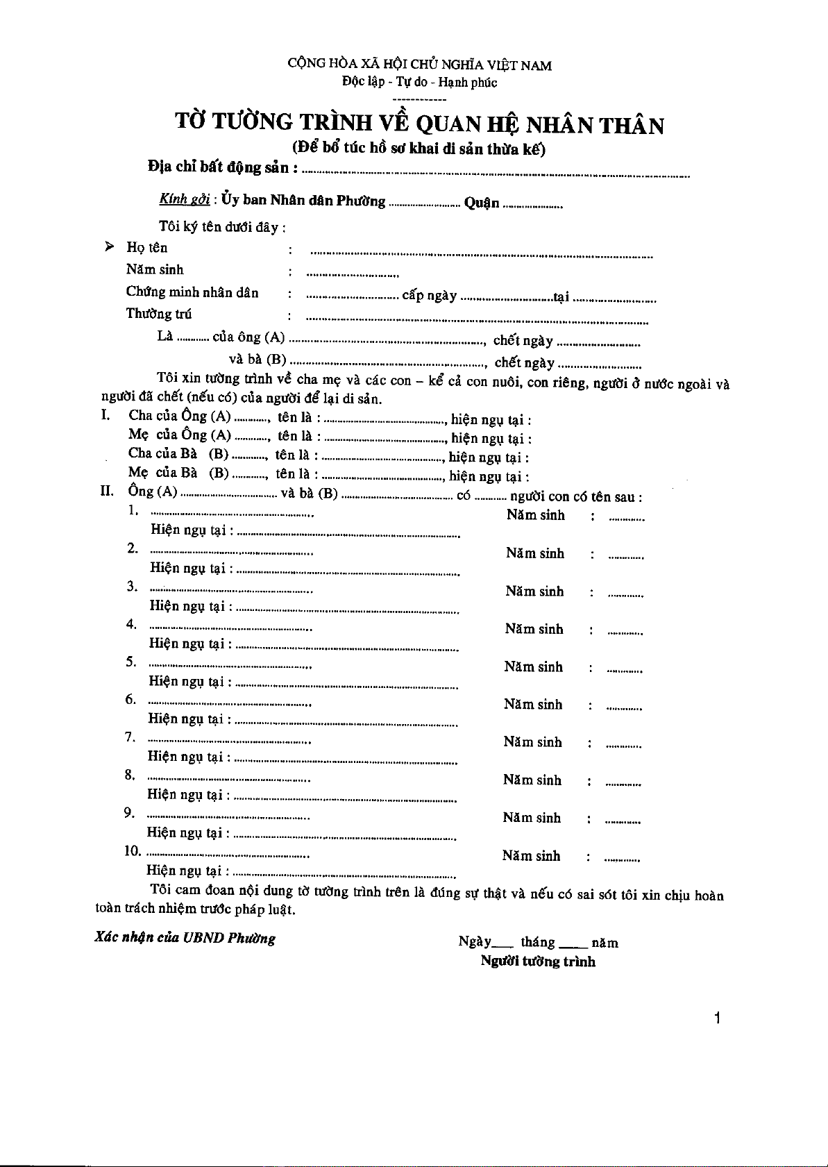 "Tờ tường trình về quan hệ nhân thân" nhằm mục đích bổ túc hồ sơ khai di sản thừa kế cho cha mẹ và các con - kể cả con nuôi, con riêng, người ở nước ngoài và người đã chết (nếu có) của người để lại tài sản. Cuối bản tường trình có lời cam đoan của người tường trình và xác nhận của UBND Phường.