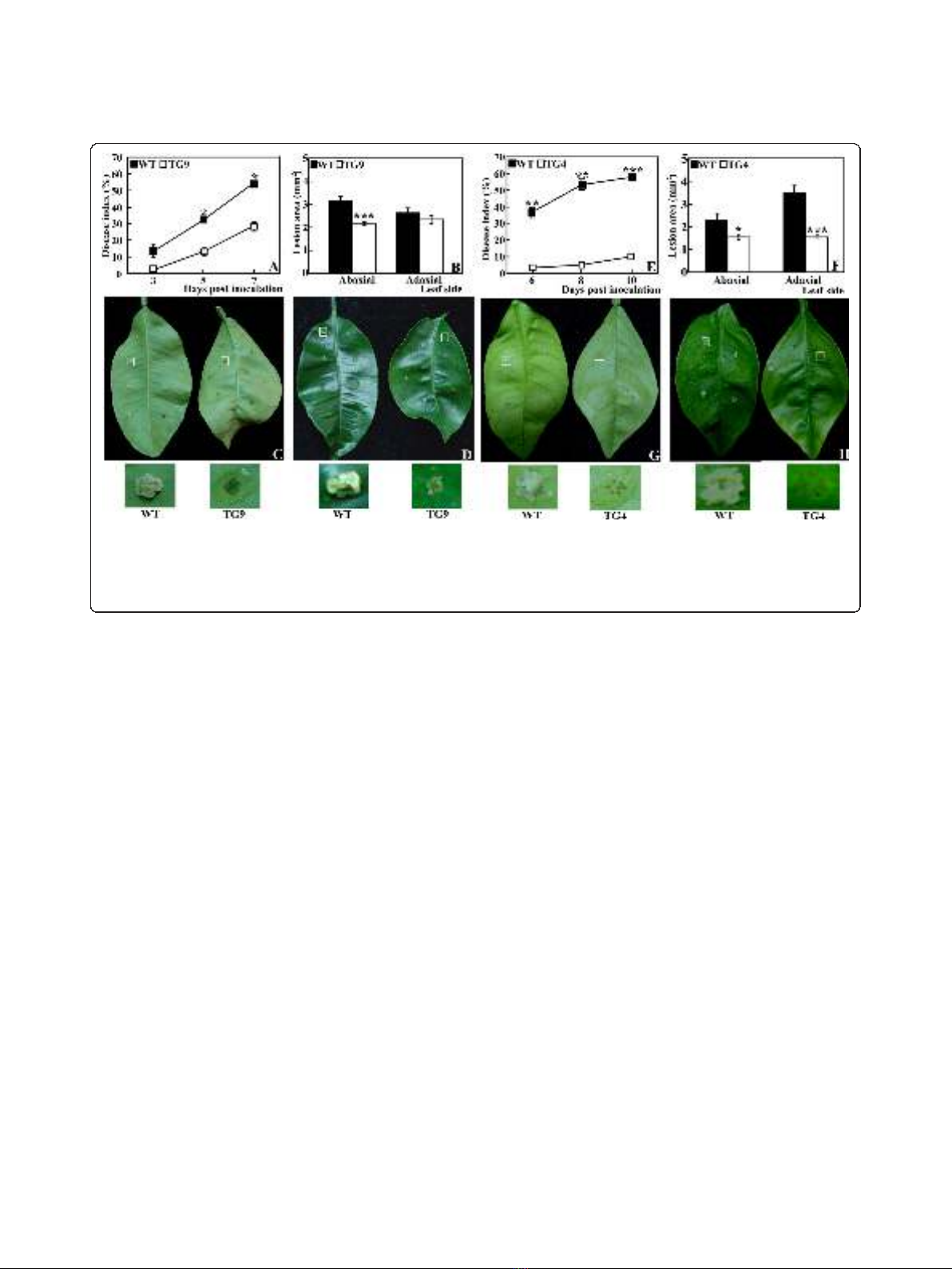 Figure 3 Canker disease tolerance assay of the wild type (WT) and the transgenic lines (TG4 and TG9). Disease index (A, E) and lesion