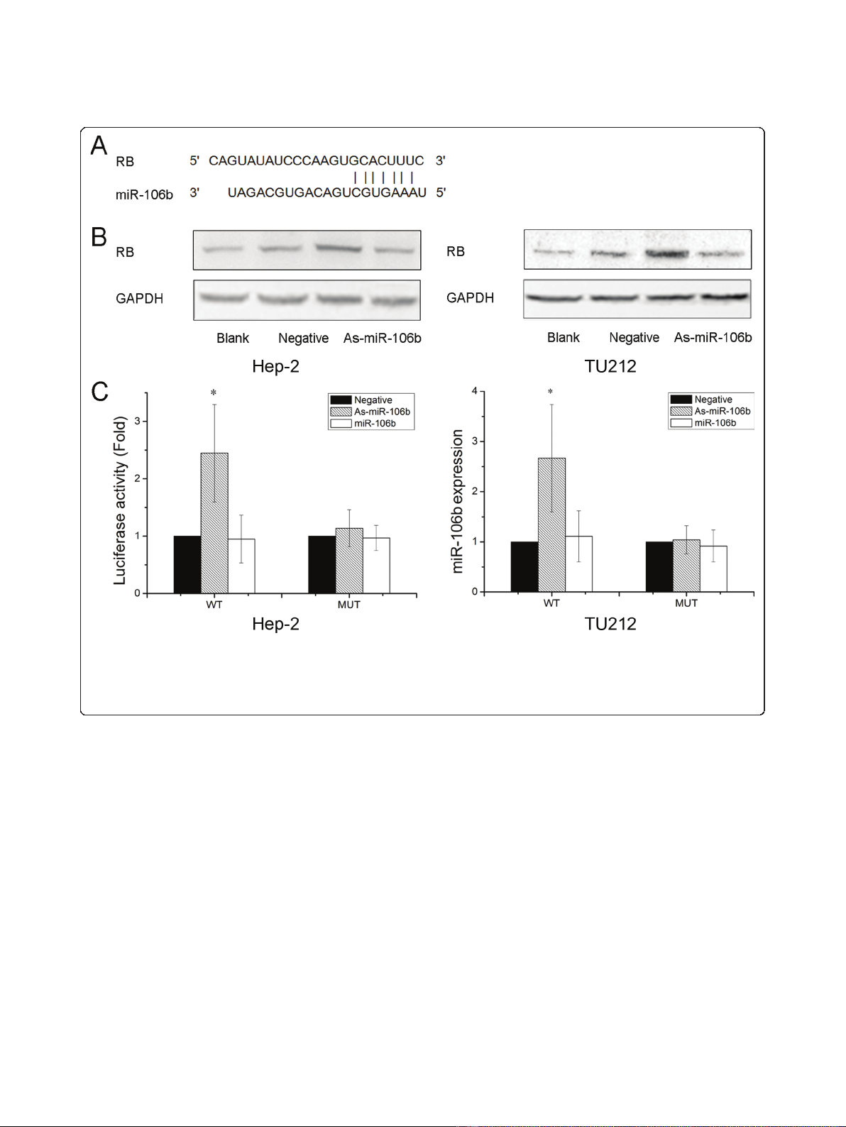 mRNA 3’UTR. (B) Cells were transfected with As-miR-106b and miR-106b, and the expression of RB was analyzed by Western blot. The expression