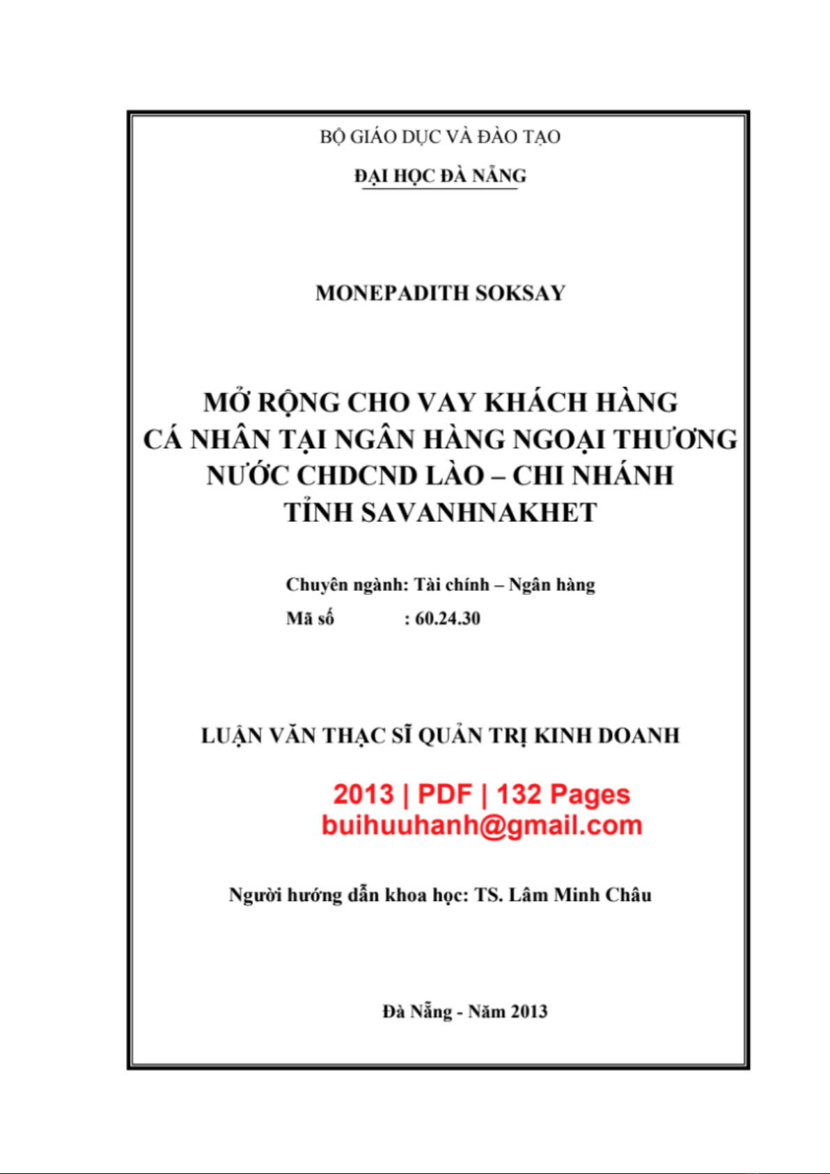 Luận văn này chủ yếu kể từ việc mở rộng cho vay khách hàng cá nhân, đã thực hiện nghiên cứu về lý luận và tình hình thực trạng của việc mở rộng cho vay khách hàng cá nhân tại Ngân hàng Ngoại thương CHDCND Lào - Chi nhánh tỉnh Savanakhet. Với số lượng khách hàng doanh nghiệp vẫn lớn hơn so với khách hàng cá nhân, việc mở rộng cho vay khách hàng cá nhân được coi là quyết liệt trong việc tăng cường doanh thu cho Ngân hàng. Ngoài ra, luận văn cũng đã thảo luận về những thách thức gây ra trong quá trình đánh giá tiền mại và chống rối khi mở rộng cho vay. Các giải pháp được đề xuất là tăng cường công tác marketing và quảng cáo, cũng như phát triển sản phẩm dịch vụ cho vay mới để có thể giúp kết nối ngân hàng với khách hàng cá nhân hiệu quả hơn. Luận văn cuối cùng đưa ra rằng việc mở rộng cho vay khách hàng cá nhân có thể giúp đẩy mạnh quá trình phát triển kinh doanh của Ngân hàng. Luận văn này có thể hữu ích cho các chuyên gia và quản trị viên kinh doanh của các NHTM, khi cần tìm hiểu vấn đề mở rộng cho vay khách hàng cá nhân.