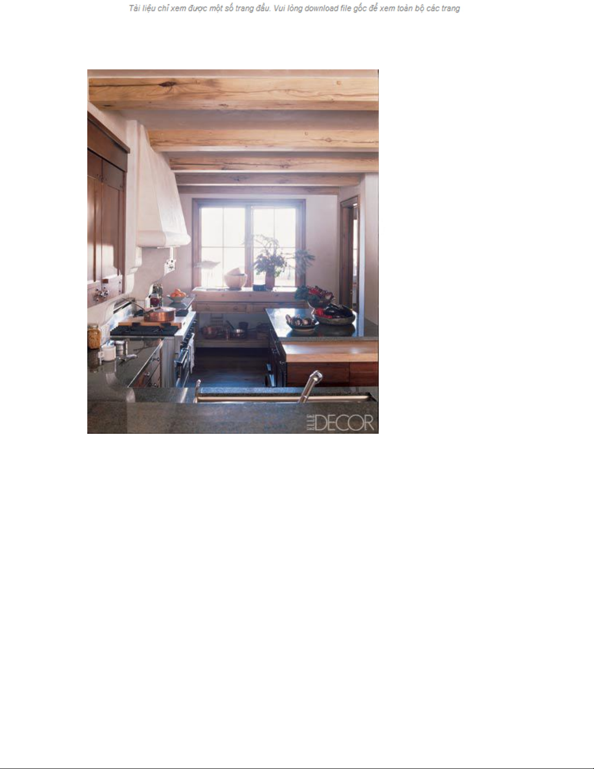 Nhà bếp mộc mạc và đơn giản với những thân gỗ sồi trên trần nhà, bàn đá granite