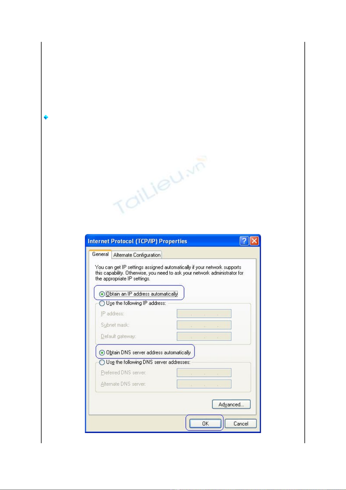Gán IP động, chọn Obtain an IP address automatically (xem hình 2)
