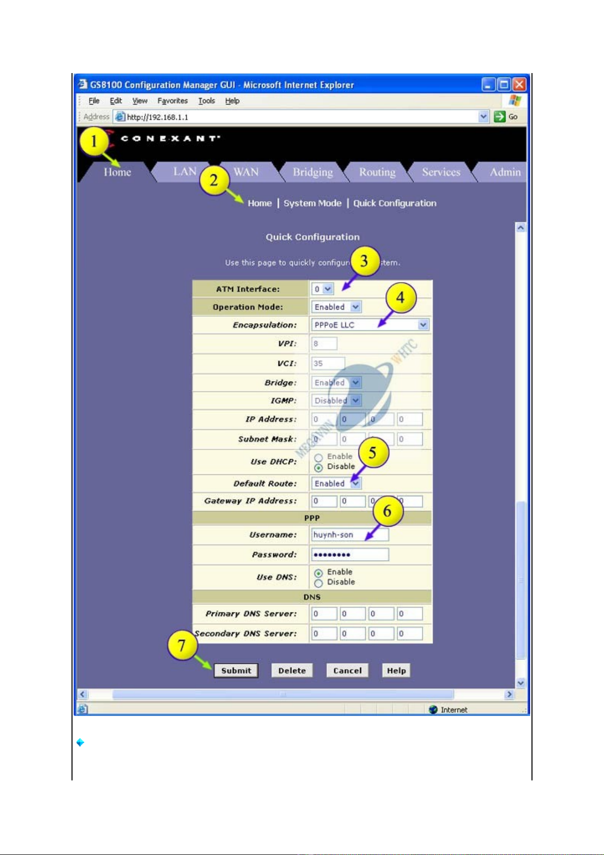 Chọn Submit (nếu đúng các thông số thì modem sẽ tự động kết nối Internet)
