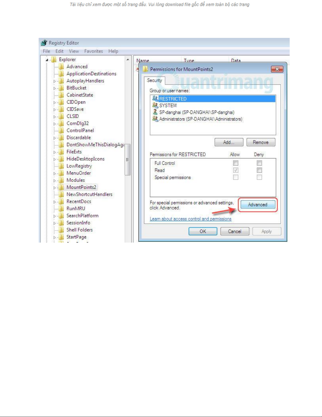 5. Cửa sổ Pemission for MountPoints2 mở ra > Advanced