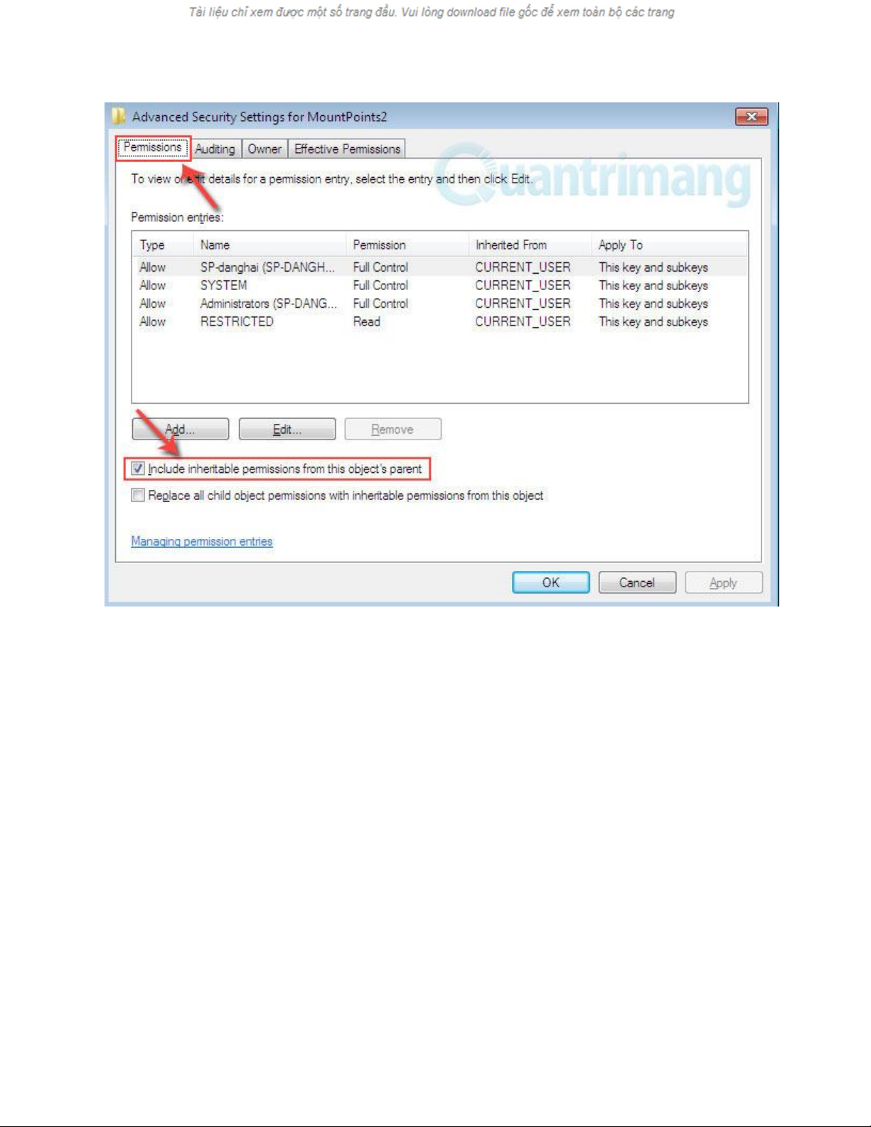 * Win XP: Bỏ chọn tính năng Inherit from parent the pemission entries that apply