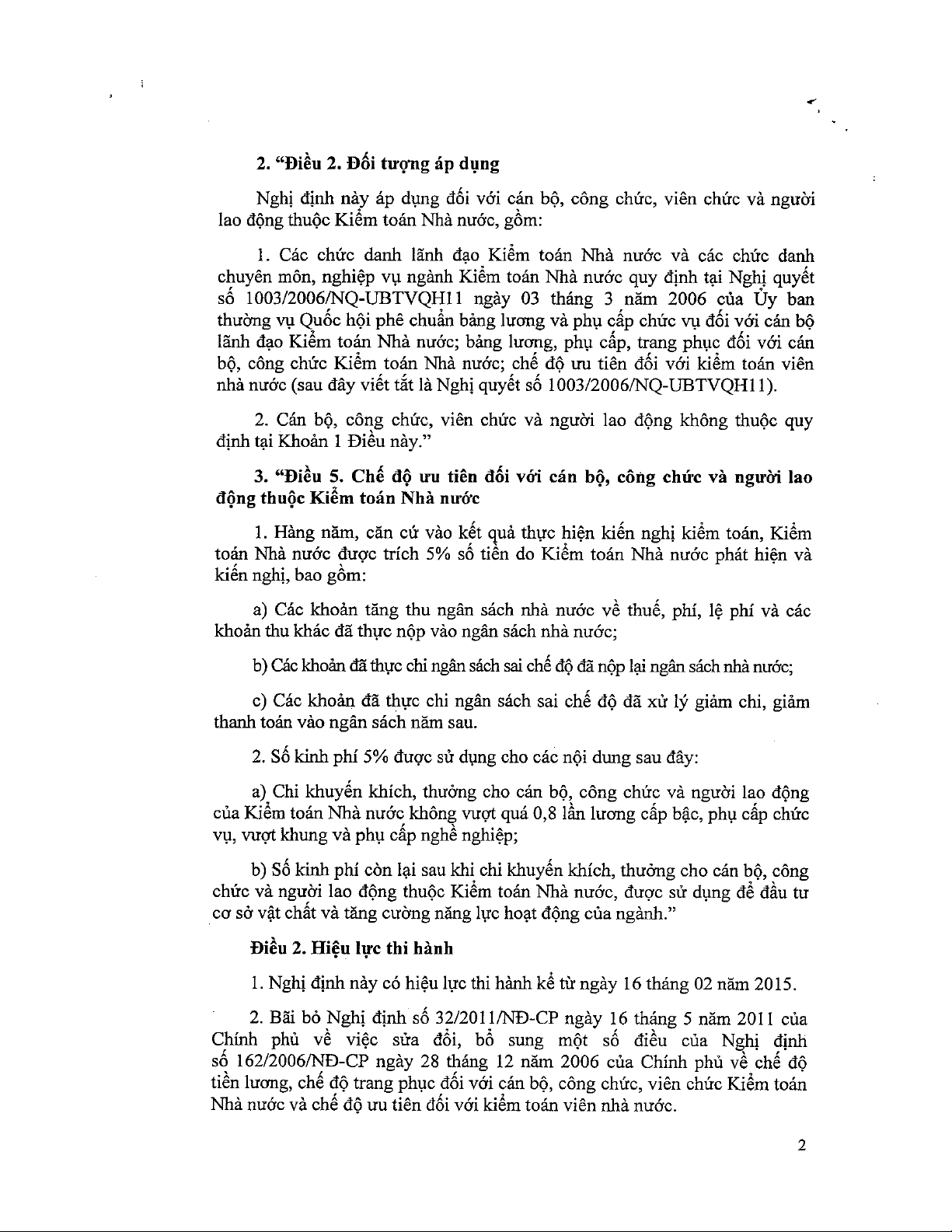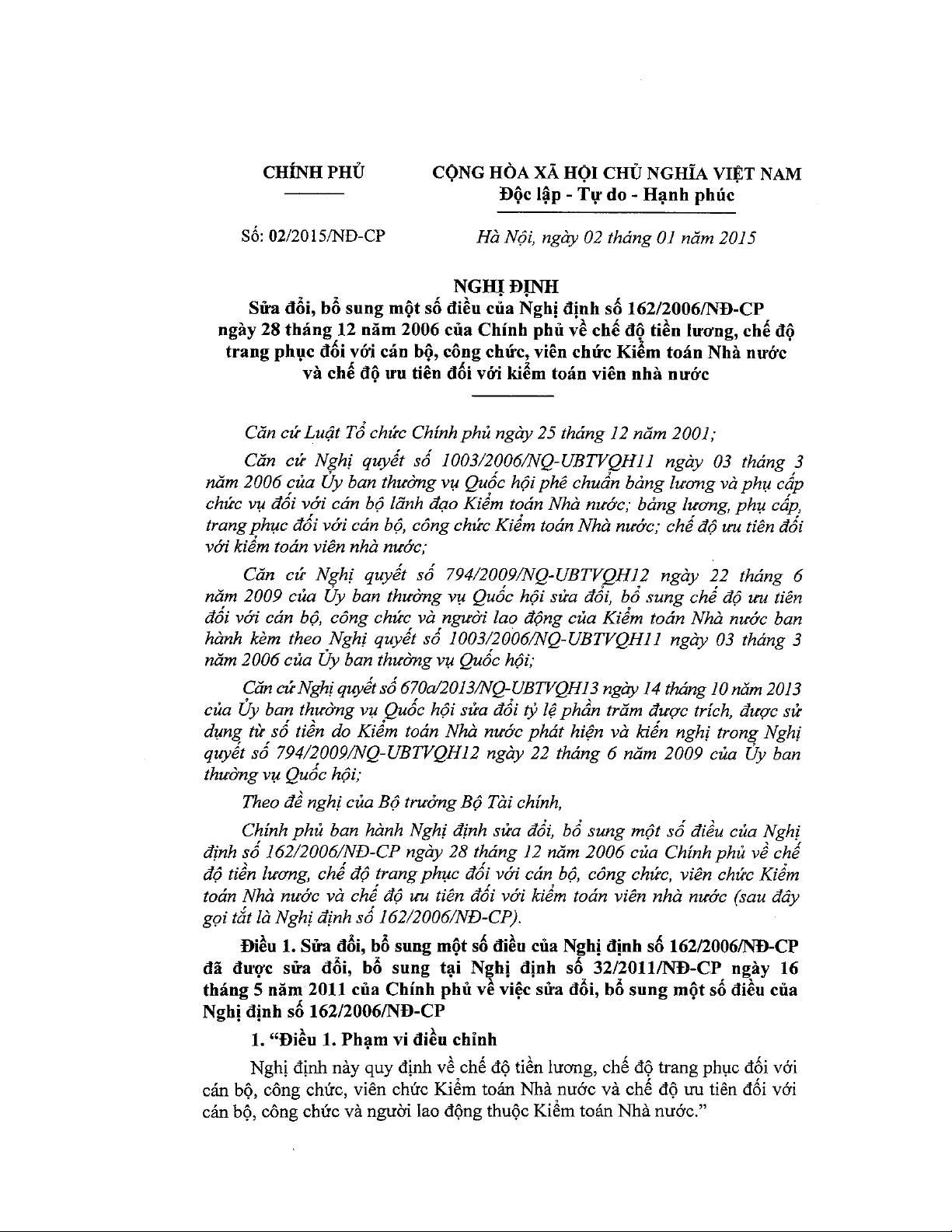Nghị định 02/2015/NĐ-CP sửa đổi Nghị định 162/2006/NĐ-CP về chế độ tiền lương, chế độ trang phục đối với cán bộ, công, viên chức Kiểm toán Nhà nước và chế độ ưu tiên đối với kiểm toán viên nhà nước.