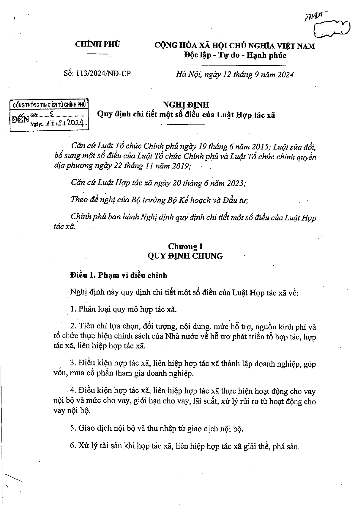 Nghị định 113/2024/NĐ-CP quy định chi tiết Luật Hợp tác xã: phân loại HTX, chính sách hỗ trợ (nhân lực, thông tin, tư vấn), nhân rộng mô hình hiệu quả, ứng dụng KHCN.