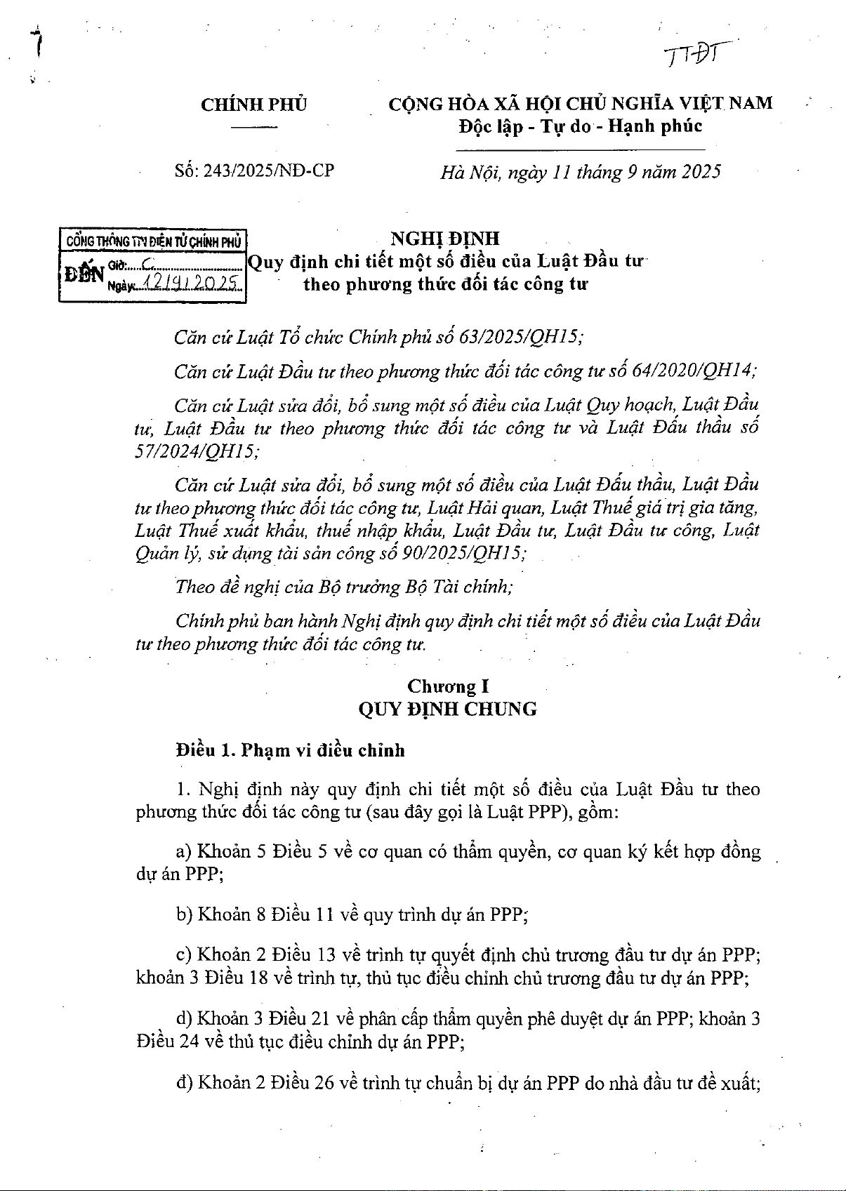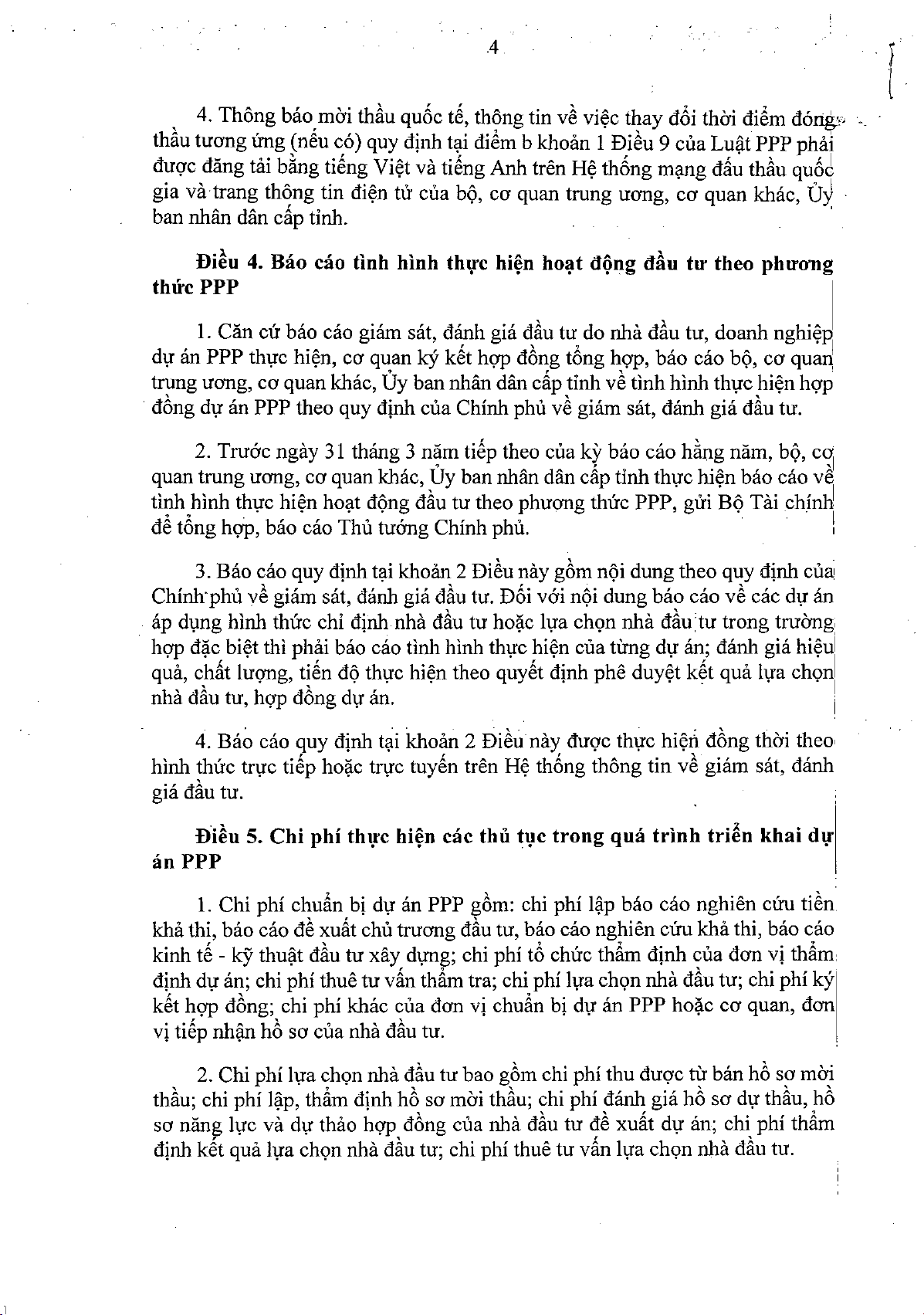 Chính phủ ban hành Nghị định quy định chi tiết một số điều của Luật Đầu tư theo phương thức đối tác công tư. Nghị định này quy định chi tiết một số điều của Luật Đầu tư theo phương thức đối tác công tư (sau đây gọi là Luật PPP), bao gồm các quy định về cơ quan có thẩm quyền, quy trình dự án PPP, trình tự quyết định chủ trương đầu tư, phân cấp thẩm quyền phê duyệt dự án, trình tự chuẩn bị dự án PPP do nhà đầu tư đề xuất, quy trình lựa chọn nhà đầu tư, xử lý tình huống, hướng dẫn hợp đồng dự án PPP, và các quy định chuyển tiếp.