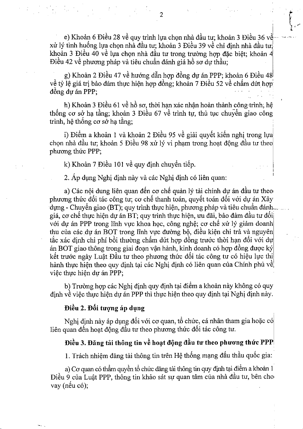 Nghị định này do Chính phủ Việt Nam ban hành nhằm quy định chi tiết một số điều của Luật Đầu tư theo phương thức đối tác công tư (Luật PPP). Văn bản pháp lý này bao gồm các quy định cụ thể về nhiều khía cạnh quan trọng của hoạt động đầu tư PPP. Cụ thể, Nghị định làm rõ các vấn đề như: xác định cơ quan có thẩm quyền và cơ quan ký kết hợp đồng dự án PPP; quy trình thực hiện dự án PPP; trình tự, thủ tục quyết định và điều chỉnh chủ trương đầu tư dự án PPP; phân cấp thẩm quyền phê duyệt dự án PPP; trình tự chuẩn bị dự án PPP do nhà đầu tư đề xuất; quy trình lựa chọn nhà đầu tư, bao gồm cả việc xử lý tình huống và chỉ định nhà đầu tư; hướng dẫn chi tiết về hợp đồng dự án PPP, tỷ lệ giá trị bảo đảm thực hiện hợp đồng và chấm dứt hợp đồng; hồ sơ và thủ tục xác nhận hoàn thành công trình, chuyển giao công trình; giải quyết kiến nghị và xử lý vi phạm trong hoạt động đầu tư PPP; và các quy định chuyển tiếp. Nghị định cũng quy định về việc áp dụng các Nghị định liên quan đến cơ chế quản lý tài chính, thanh toán, quyết toán đối với các dự án Xây dựng - Chuyển giao (BT), các dự án BOT giao thông, cũng như các dự án PPP trong lĩnh vực khoa học, công nghệ. Đối tượng áp dụng của Nghị định là các cơ quan, tổ chức, cá nhân tham gia hoặc có liên quan đến hoạt động đầu tư theo phương thức đối tác công tư. Ngoài ra, Nghị định còn quy định chi tiết về trách nhiệm đăng tải thông tin trên Hệ thống mạng đấu thầu quốc gia, báo cáo tình hình thực hiện hoạt động đầu tư PPP, chi phí thực hiện các thủ tục trong quá trình triển khai dự án PPP, nhiệm vụ thẩm định, thẩm tra báo cáo nghiên cứu tiền khả thi và báo cáo đề xuất chủ trương đầu tư, cũng như quy định về khảo sát sự quan tâm của nhà đầu tư đối với dự án PPP.