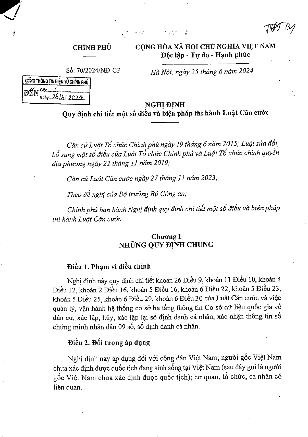 Nghị định số 70/2024/NĐ-CP ban hành về việc uy định chi tiết một số điều và biện pháp thi hành luật căn cước. Căn cứ Luật Tổ chức Chính phủ ngày 19 tháng 6 năm 2015; Luật sửa đổi, bổ sung một số điều của Luật Tổ chức Chính phủ và Luật Tổ chức chính quyền địa phương ngày 22 tháng 11 năm 2019.