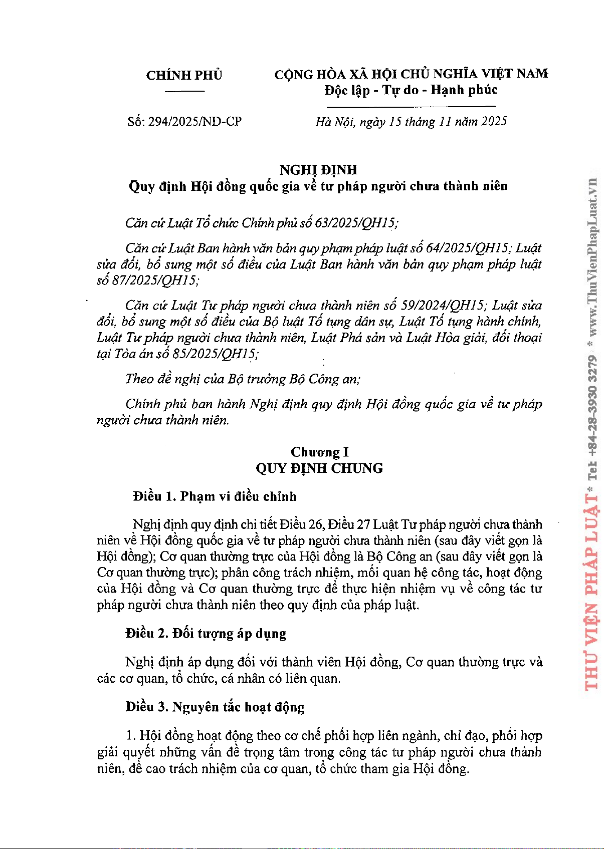 Nghị định này cụ thể hóa các quy định của Luật Tư pháp người chưa thành niên, tập trung vào việc thiết lập và quy định chi tiết hoạt động của Hội đồng quốc gia về tư pháp người chưa thành niên. Mục tiêu chính là tạo ra một cơ chế phối hợp liên ngành hiệu quả, đảm bảo sự lãnh đạo thống nhất và giải quyết kịp thời các vấn đề trọng tâm trong công tác tư pháp người chưa thành niên, đặc biệt nhấn mạnh nguyên tắc đề cao trách nhiệm của các cơ quan, tổ chức tham gia. Nghị định xác định phạm vi điều chỉnh, đối tượng áp dụng và các nguyên tắc hoạt động cơ bản của Hội đồng, với Cơ quan thường trực được giao cho Bộ Công an. Nội dung trọng tâm của Nghị định bao gồm việc quy định chi tiết về thành phần, nhiệm vụ, quyền hạn của Hội đồng, của Chủ tịch, các Phó Chủ tịch và thành viên Hội đồng, cũng như của Cơ quan thường trực. Các điều khoản làm rõ mối quan hệ công tác giữa các thành viên, giữa Hội đồng và Cơ quan thường trực, cũng như với các bộ, ngành ở trung ương và Ủy ban nhân dân các cấp địa phương. Phương pháp tiếp cận của Nghị định là xây dựng một khuôn khổ pháp lý toàn diện, từ quy trình họp, chế độ báo cáo, đến công tác đánh giá, kiểm tra việc thực hiện các nhiệm vụ về tư pháp người chưa thành niên. Giá trị ứng dụng và hàm ý của văn bản này là rất lớn, góp phần chuẩn hóa và nâng cao chất lượng hoạt động tư pháp người chưa thành niên, bảo vệ tối đa quyền và lợi ích hợp pháp của trẻ em, đồng thời tăng cường sự phối hợp giữa các cấp, các ngành trong toàn hệ thống chính trị xã hội. Nghị định có hiệu lực từ ngày 01 tháng 01 năm 2026.