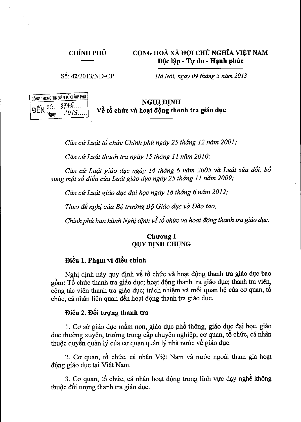 Nghị định số: 42/2013/NĐ-CP về tổ chức và hoạt động thanh tra giáo dục