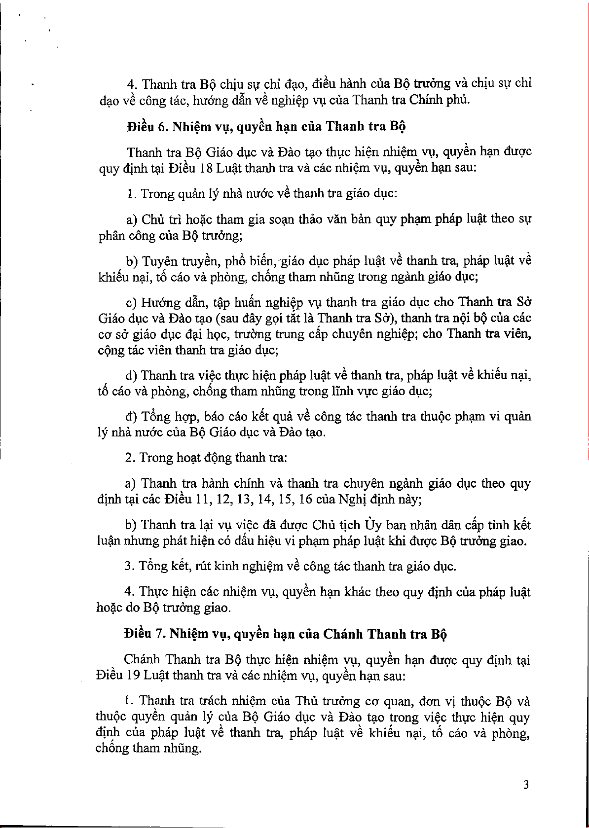 Nghị định số: 42/2013/NĐ-CP về tổ chức và hoạt động thanh tra giáo dục do Thủ tướng chính phủ ban hành vào ngày 9 tháng 5 năm 2013. Nghị định có tổng 7 chương với 29 điều. Trong đó, trình bày về nội dung: quy định chung; tổ chức thanh tra giáo dục; hoạt động thanh tra giáo dục; thanh tra viên và cộng tác viên thanh tra giáo dục; trách nhiệm và mối quan hệ của các cơ quan, tổ chức, cá nhân trong hoạt động thanh tra giáo dục; điều kiện đảm bảo hoạt động thanh tra, giải quyết khiếu nại, tố cáo và các nội dung khác về hoạt động thanh tra giáo dục; điều khoản thi hành.
