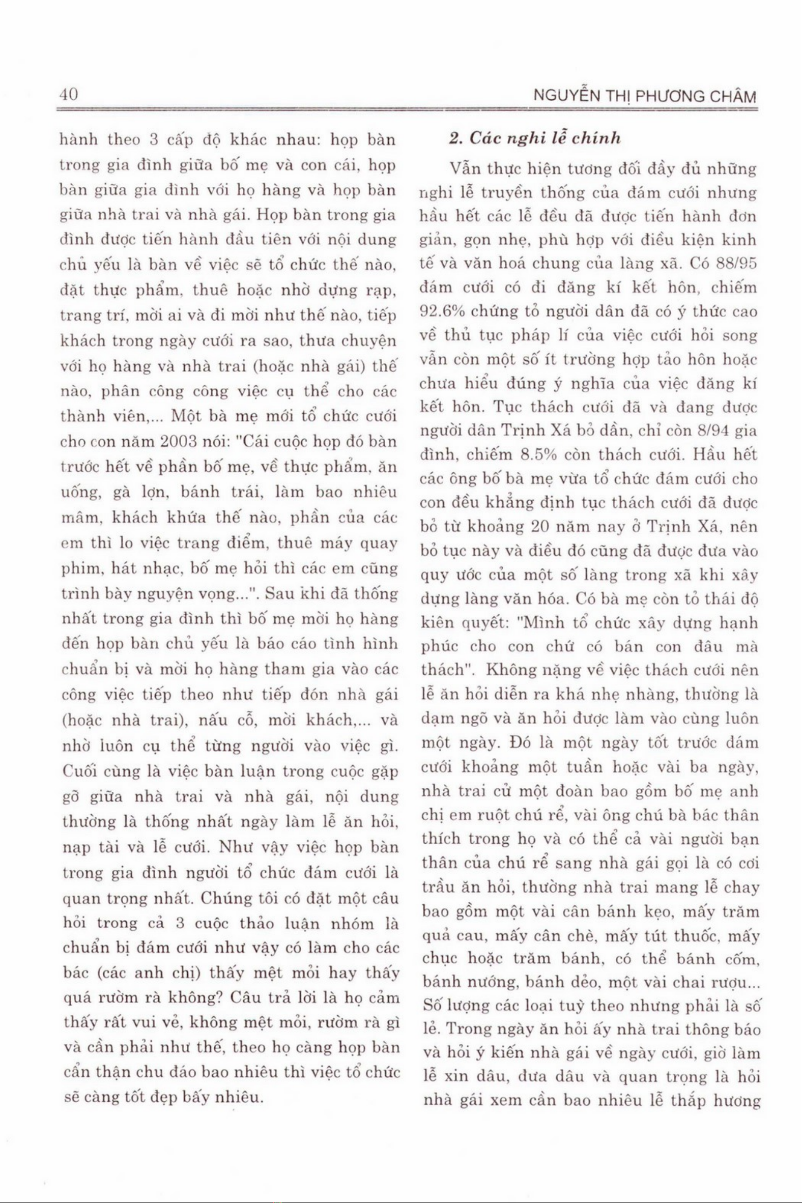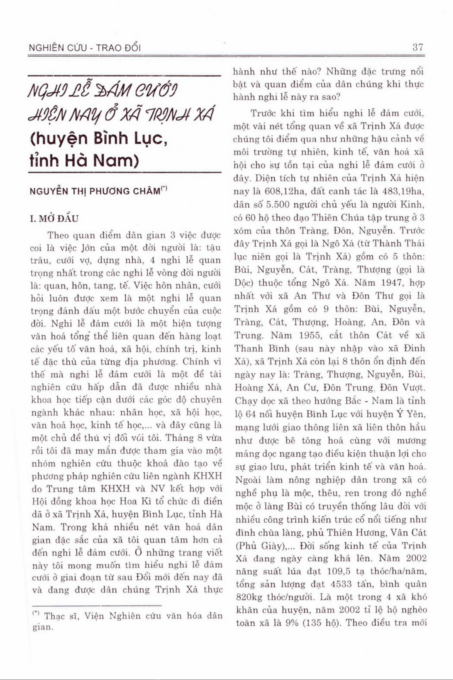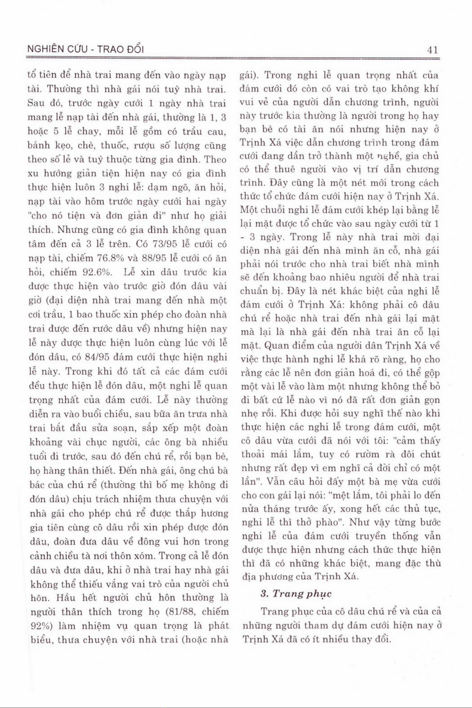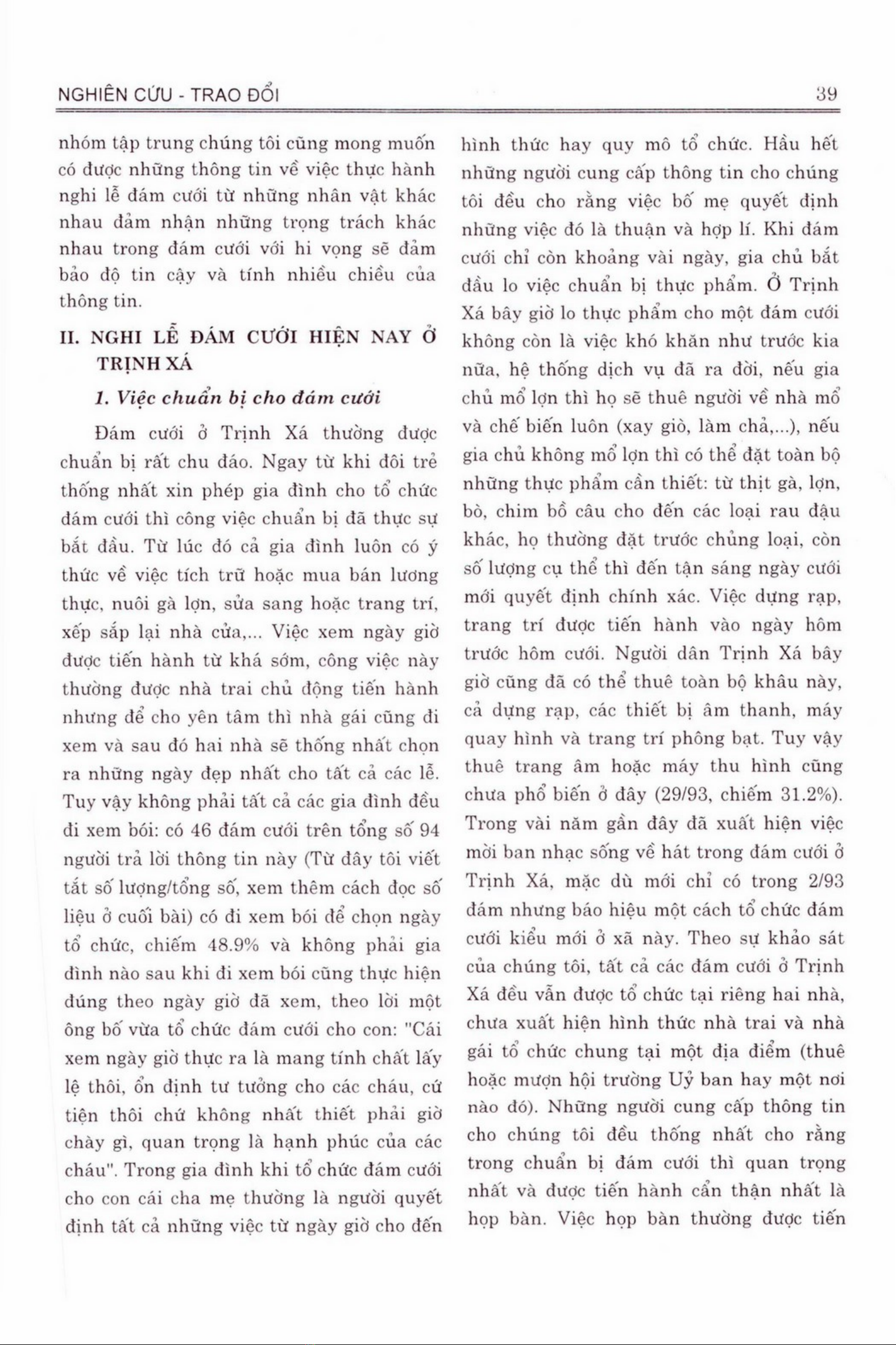 Nghi lễ đám cưới ở xã Trịnh Xá là một văn hóa phổ biến và quyền riêng lẻ, được kỳ vọng là một trong những điểm nghĩa của con người tại đây. Bài viết này chú trình quy trình tổ chức của nghi lễ đám cưới, mô tả từng bước từ khấn vái, làm lễ, đến trang trí. Mỗi nghi thức có chiếm quyền riêng lẻ, và chúng đều trình bày những giá trị cốt lõi, mang đậm chất tinh thần sâu sắc của người dân tại Trịnh Xá. Ngoài ra, bài viết cũng chú trình các yếu tố hiện đại đang ngày càng được áp dụng, như nhạc sống và ánh sáng, thay đổi của nghi lễ theo thời gian. Bài viết này mang đến cho người đọc một bức tường trong văn hóa, xã hội, và sự thay đổi của nghi lễ đám cưới tại Trịnh Xá.