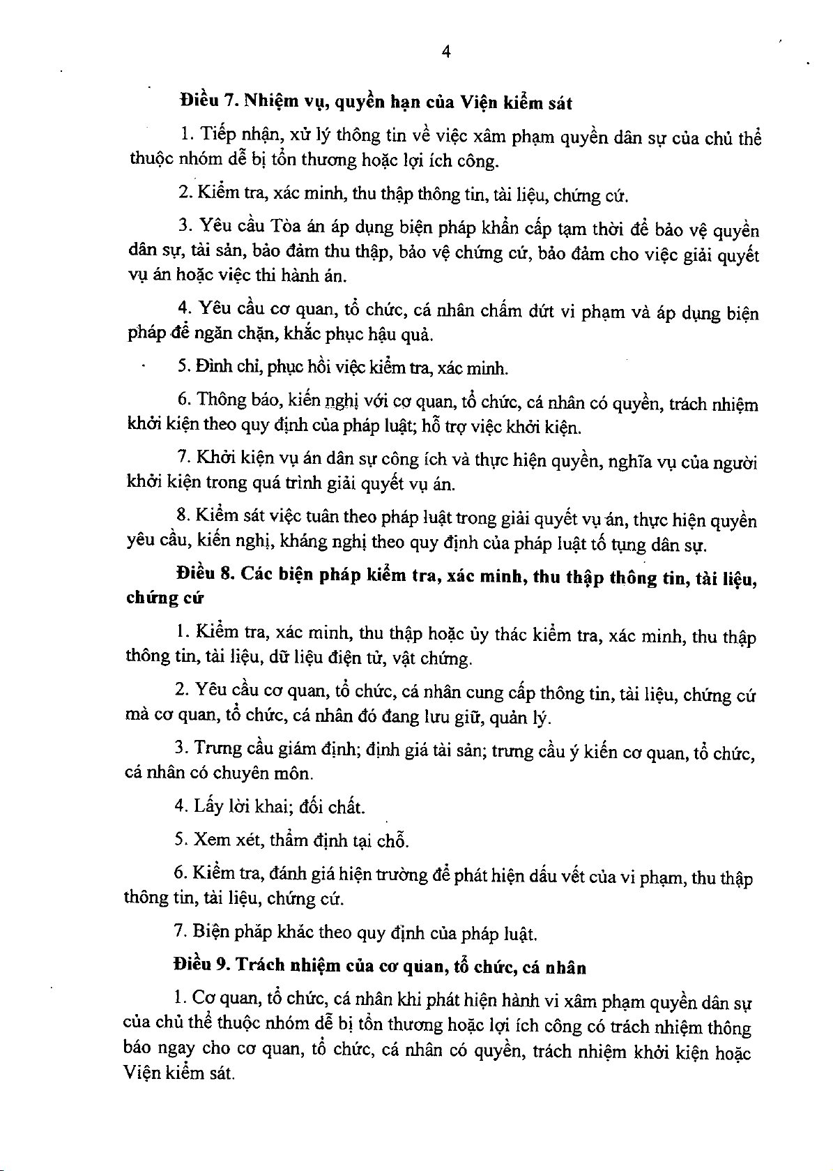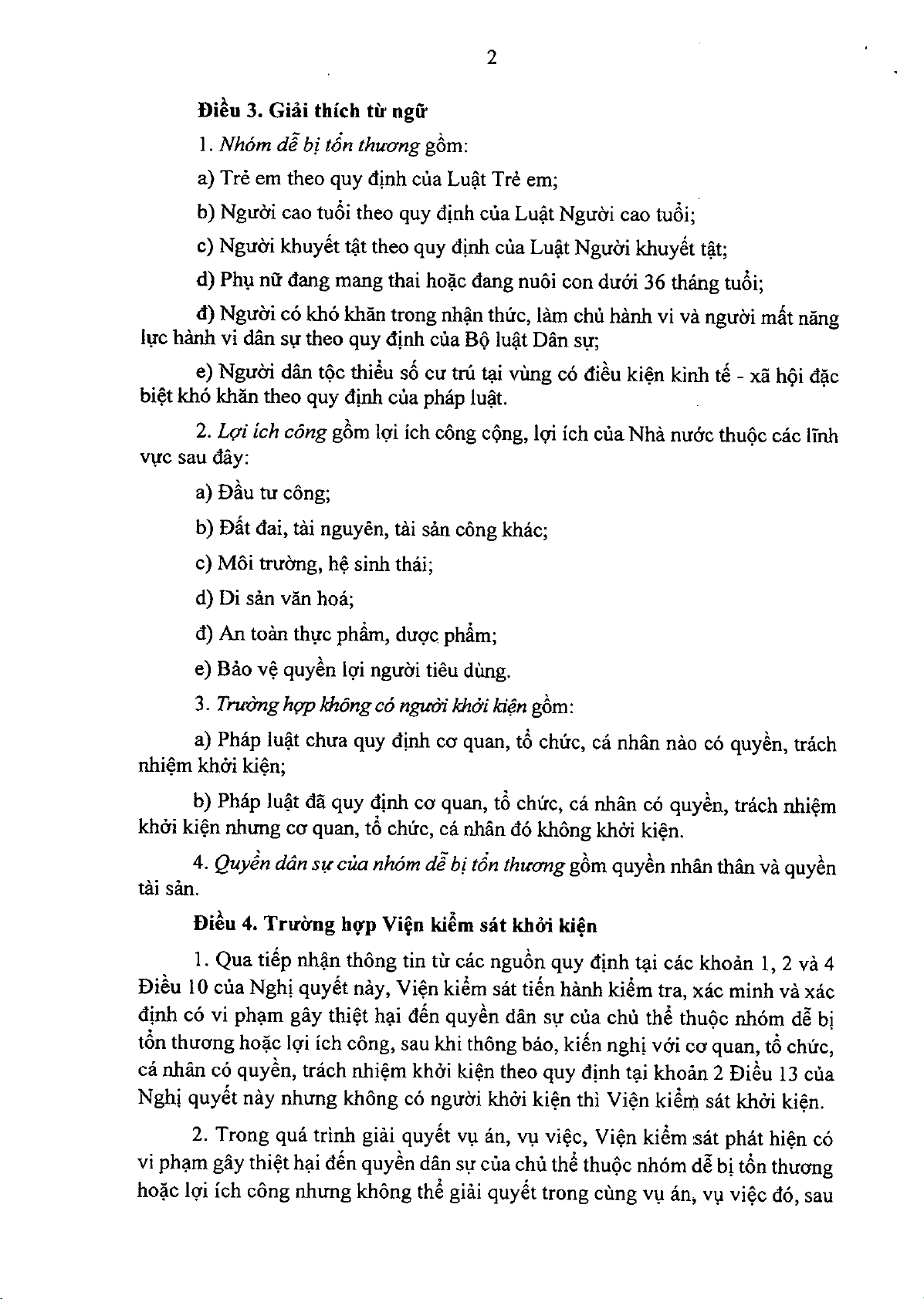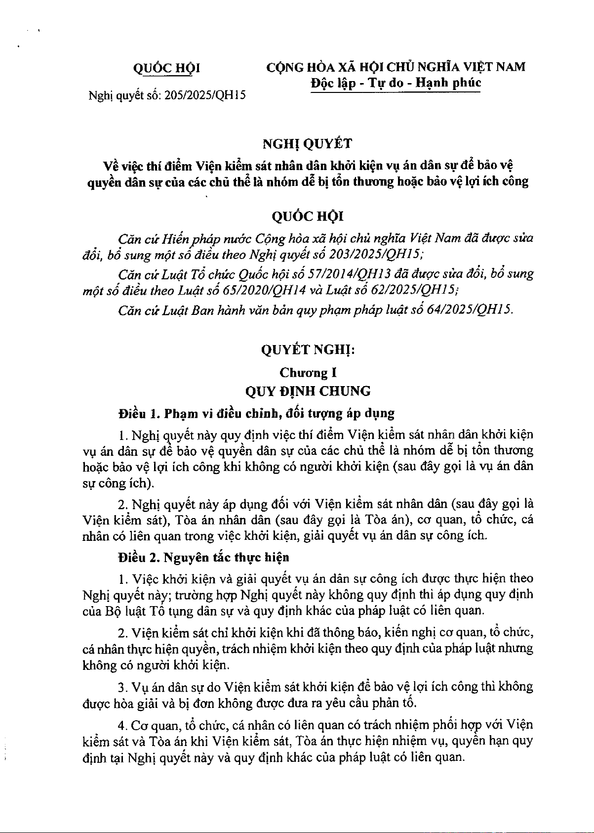 Nghị quyết số 205/2025/QH15 của Quốc hội quy định về việc thí điểm Viện kiểm sát nhân dân khởi kiện vụ án dân sự để bảo vệ quyền dân sự của các chủ thể thuộc nhóm dễ bị tổn thương hoặc bảo vệ lợi ích công. Nghị quyết này áp dụng cho Viện kiểm sát, Tòa án và các tổ chức, cá nhân liên quan, đồng thời quy định chi tiết các nguyên tắc thực hiện, bao gồm việc Viện kiểm sát chỉ khởi kiện khi đã thông báo, kiến nghị nhưng không có người khởi kiện. Các vụ án dân sự công ích do Viện kiểm sát khởi kiện sẽ không được hòa giải và bị đơn không được phản tố, nhằm đảm bảo hiệu quả bảo vệ lợi ích công và nhóm dễ bị tổn thương. Nghị quyết cũng giải thích rõ ràng khái niệm về nhóm dễ bị tổn thương (trẻ em, người cao tuổi, người khuyết tật, phụ nữ mang thai/nuôi con nhỏ, người khó khăn về nhận thức/hành vi, người dân tộc thiểu số vùng đặc biệt khó khăn) và lợi ích công (đầu tư công, đất đai, môi trường, an toàn thực phẩm, quyền lợi người tiêu dùng). Về phương pháp, văn bản này chi tiết hóa thẩm quyền khởi kiện của Viện kiểm sát ở các cấp, quy trình tiếp nhận thông tin, kiểm tra, xác minh, thu thập tài liệu, chứng cứ, cũng như việc đình chỉ hoặc phục hồi kiểm tra. Nếu không có chủ thể nào khởi kiện hoặc không nhận được phản hồi, Viện kiểm sát sẽ xem xét quyết định khởi kiện vụ án dân sự công ích hoặc vụ án bảo vệ quyền dân sự của nhóm dễ bị tổn thương khi họ không thể tự mình khởi kiện. Tòa án có trách nhiệm thụ lý các vụ án này. Nghị quyết có ý nghĩa quan trọng trong việc nâng cao hiệu quả bảo vệ quyền và lợi ích hợp pháp cho các đối tượng yếu thế và cộng đồng, khẳng định vai trò tích cực của Viện kiểm sát trong hệ thống tư pháp.
