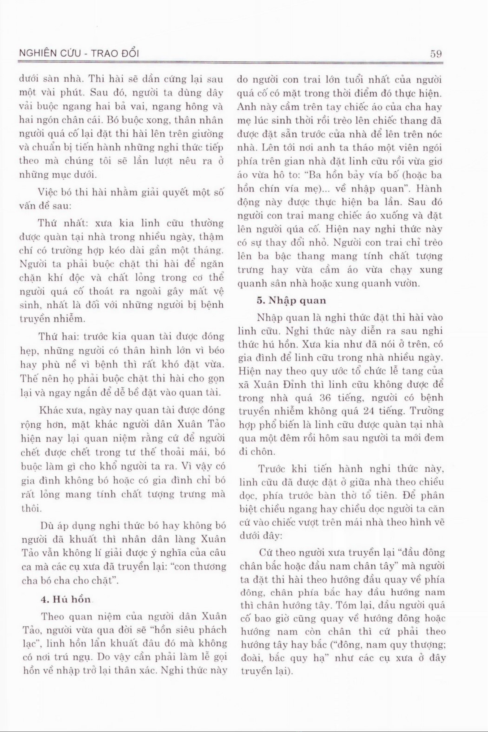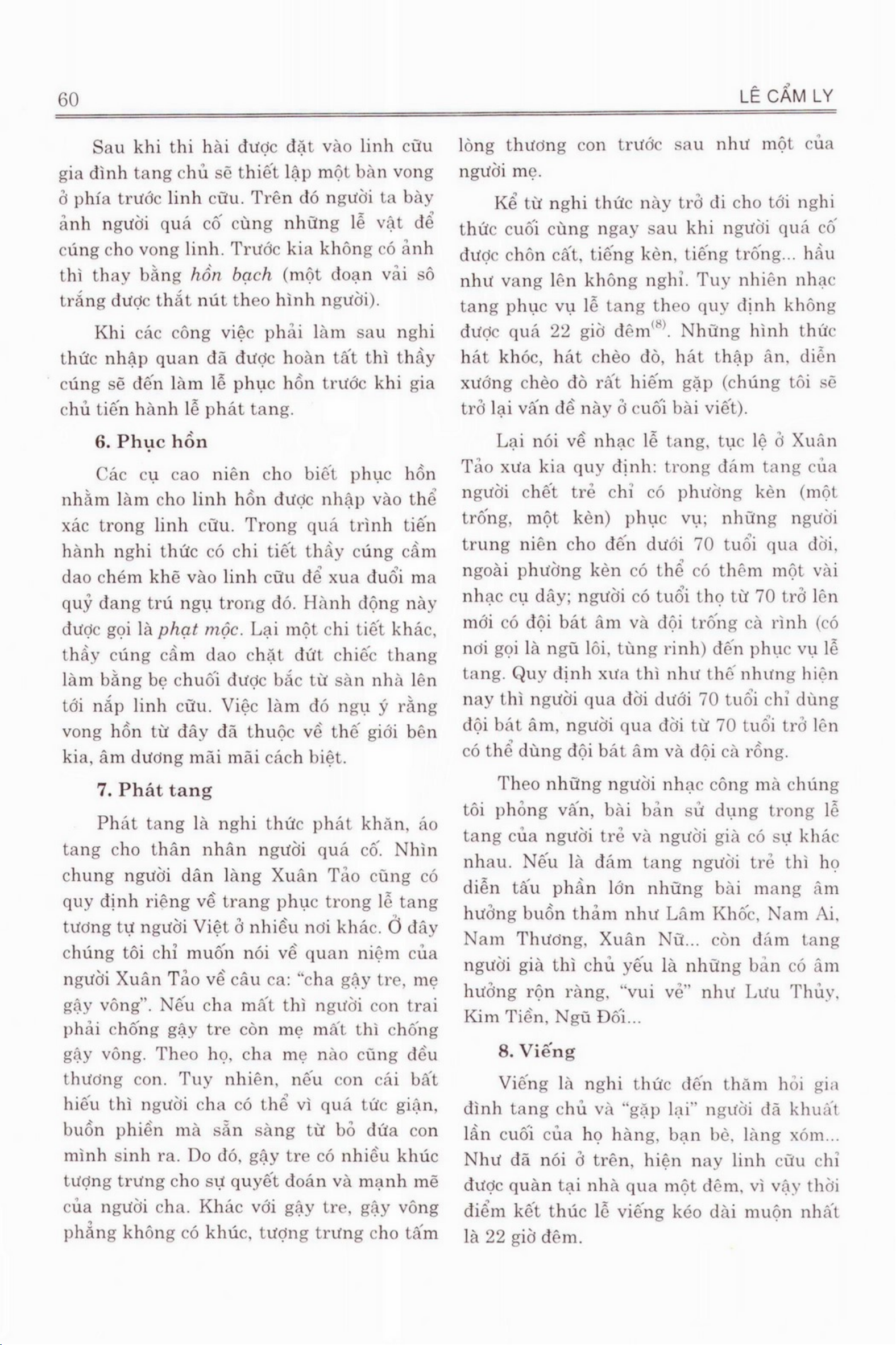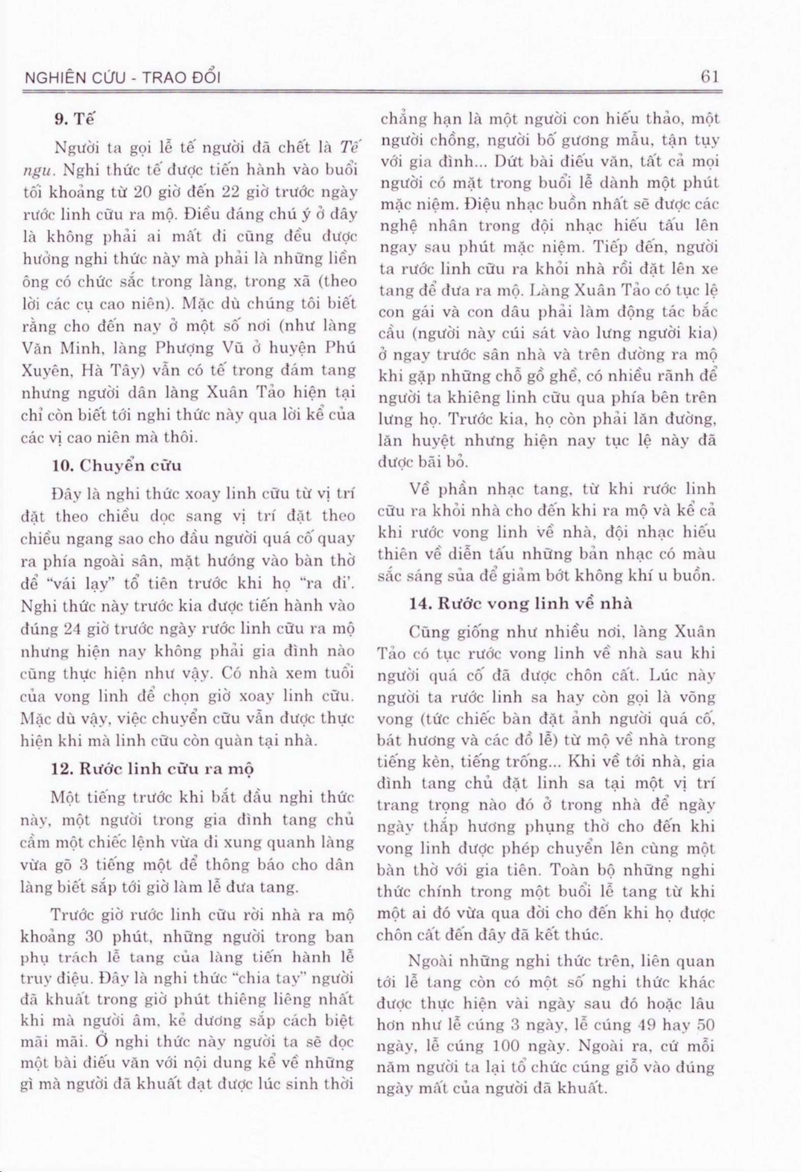 Tài liệu Về nghi thức tang ma của người Việt ở làng Xuân Tảo, xã Xuân Định, huyện Từ Liêm đưa ra một chi tiết tìm hiểu về các nghi thức tang ma trong làng Xuân Tảo. Nghi thức tang ma được phân loại theo nhiều giai đoạn: lễ nhập quan, lễ viếng và tiễn đưa, các nghi lễ khác. Mỗi giai đoạn có ý nghĩa riêng và thể hiện lòng tôn kính, chia sẻ nỗi buồn của người dân. Trong bài viết, đề xuất một số biện pháp để giữ và hình thành văn hóa tang ma tại làng Xuân Tảo khắc nghiệm trong việc bảo tồn và phát triển của thế mạng lưới xã hội Việt Nam. Ngoài ra, tài liệu cũng giúp đánh giá hiệu quả các biện pháp hiện có đối với việc bảo tồn nghi thức tang ma và góp phần để trình bày cho khán giả những thông tin hữu ích về văn hóa tang ma của người Việt.