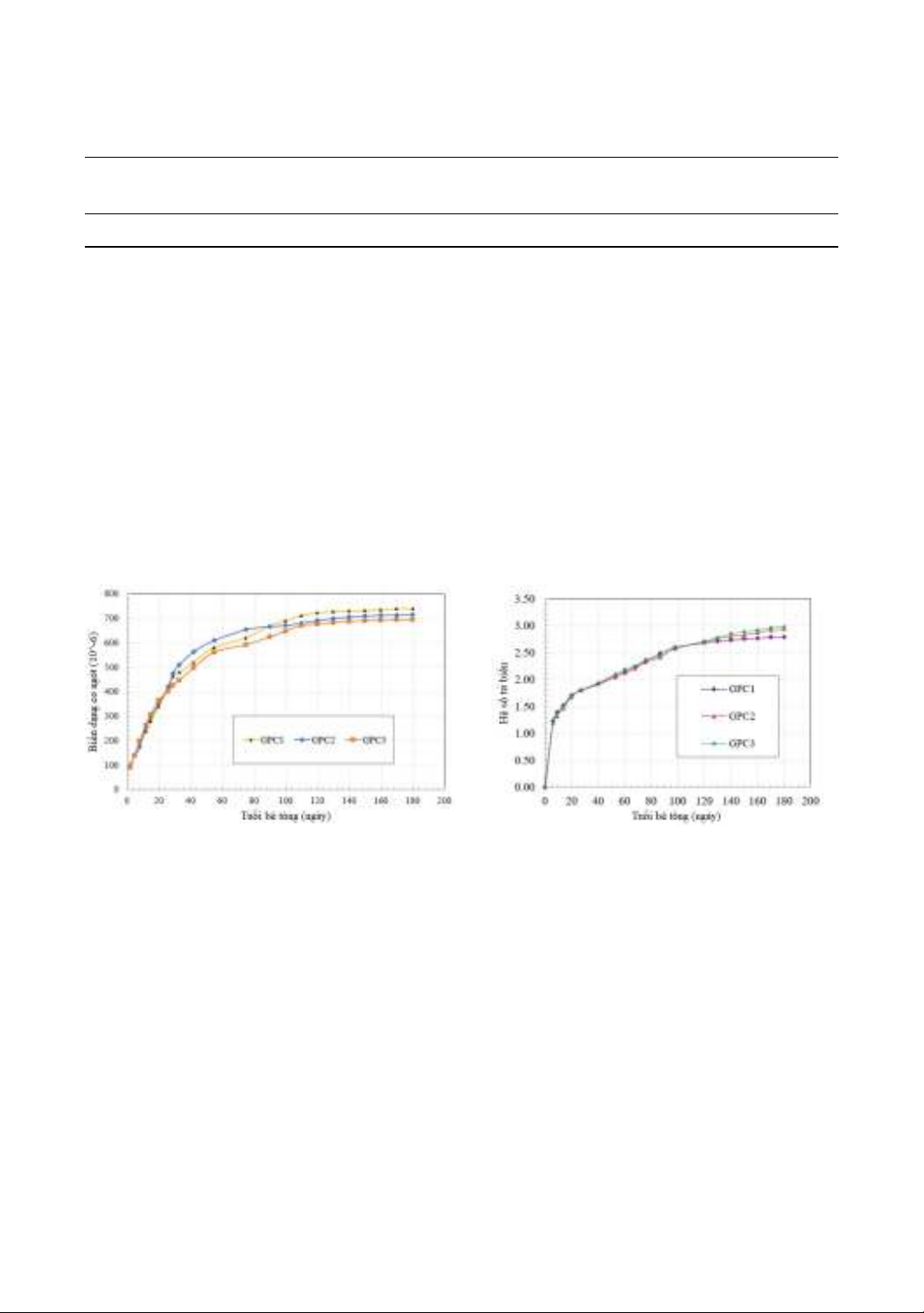 Hình 1. Biến dạng tỷ đối do co ngót của 3 mẫu GPC Hình 2. Hệ số từ biến của 3 mẫu GPC