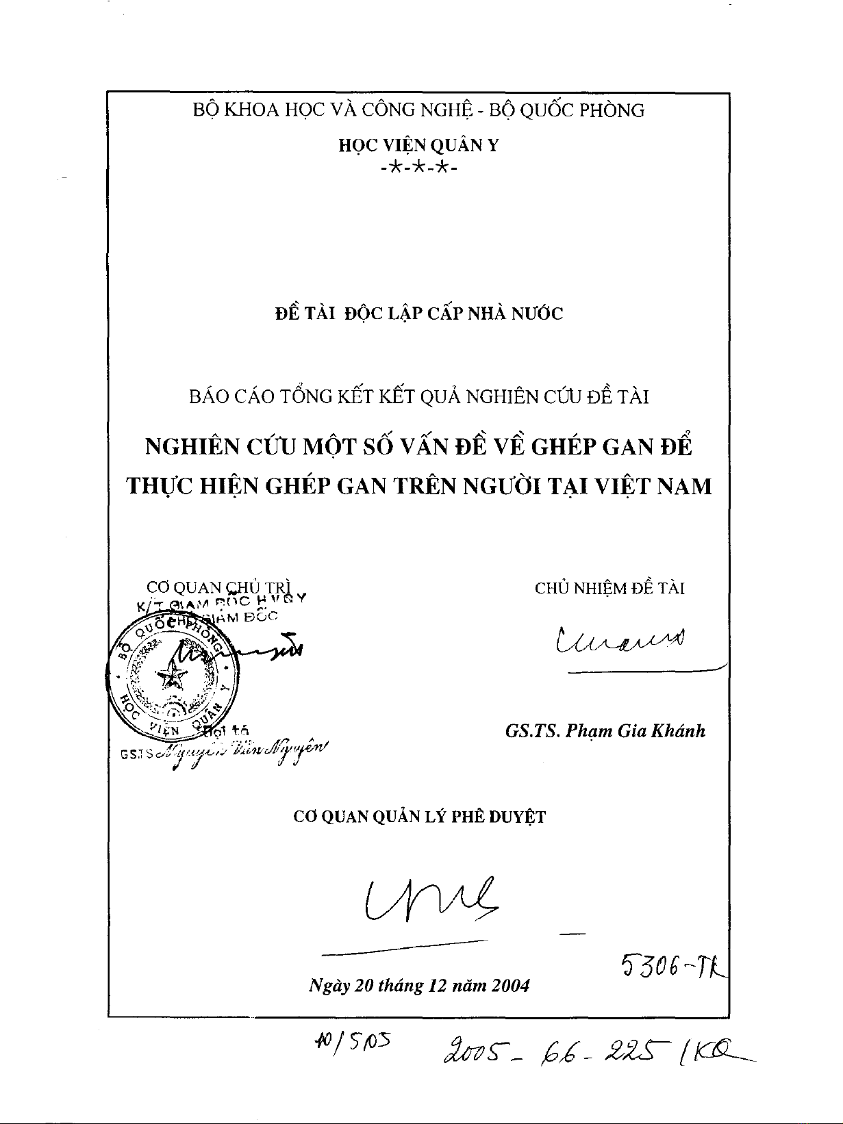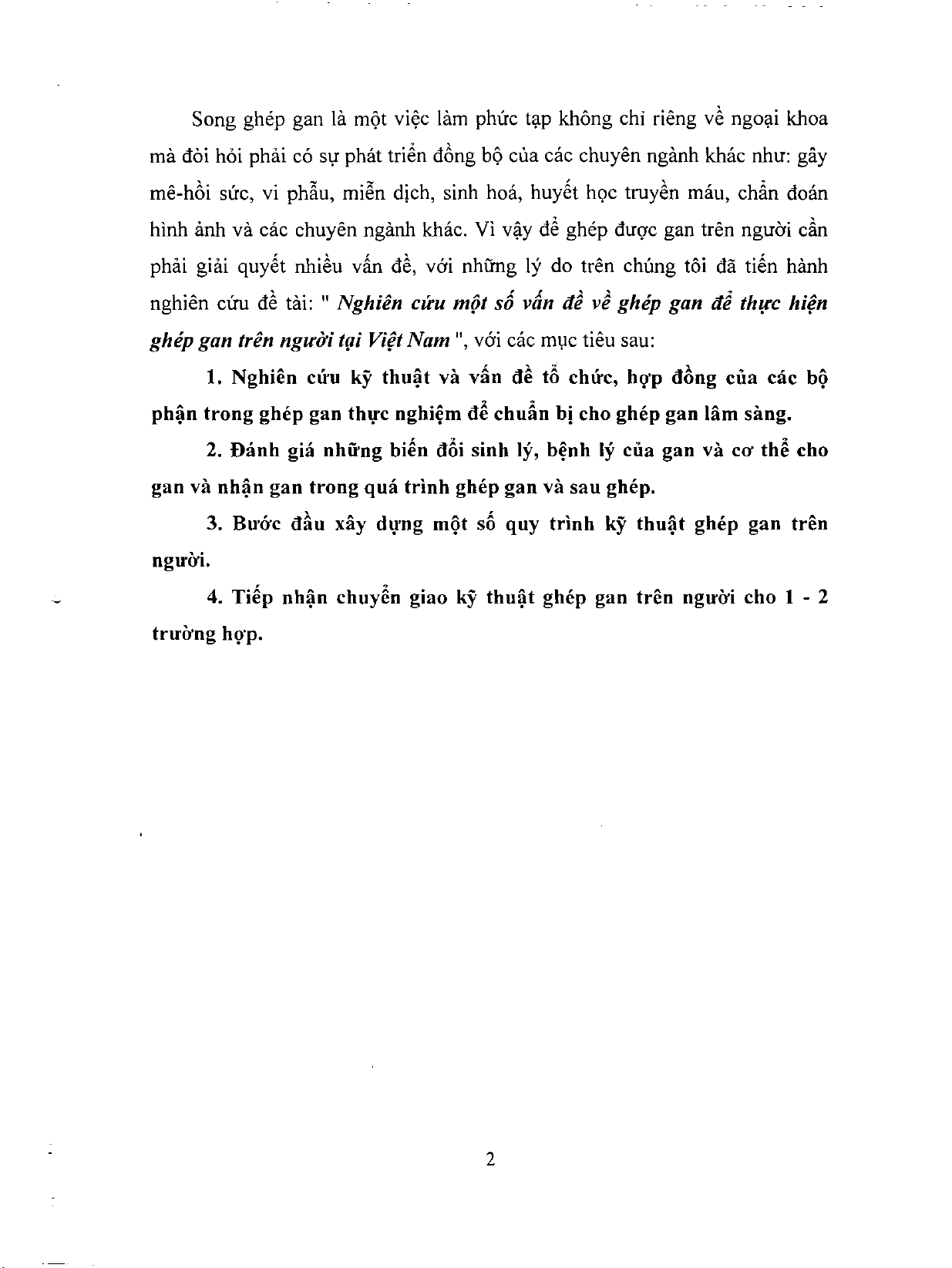 Nghiên cứu kỹ thuật và vấn đề tổ chức, hợp đồng của các bộ phận trong ghép gan thực nghiệm để chuẩn bị cho ghép gan lâm sàng. Đánh giá những biến đổi sinh lý, bệnh lý của gan và cơ thể cho gan và nhận gan trong quá trình ghép gan và sau ghép. Bước đầu xây