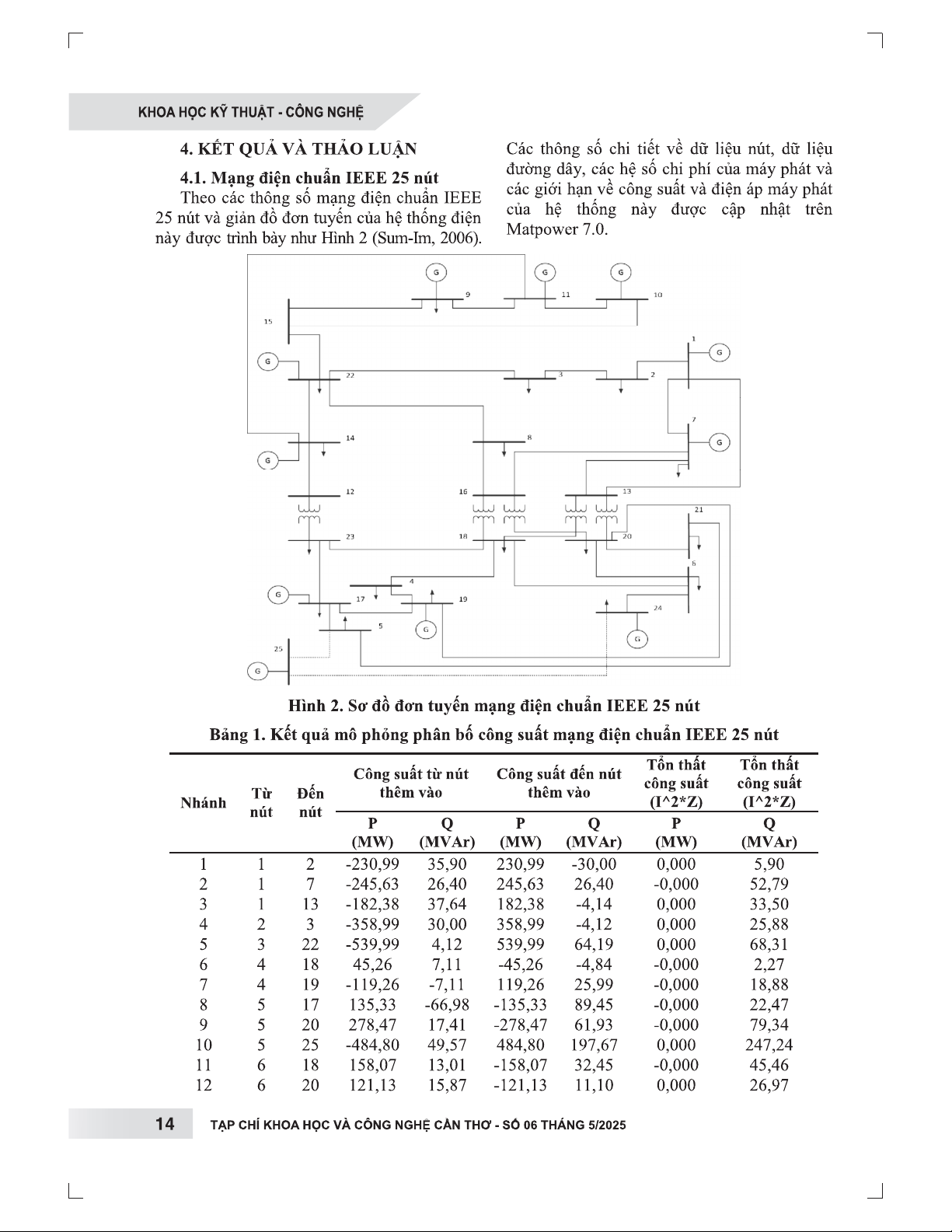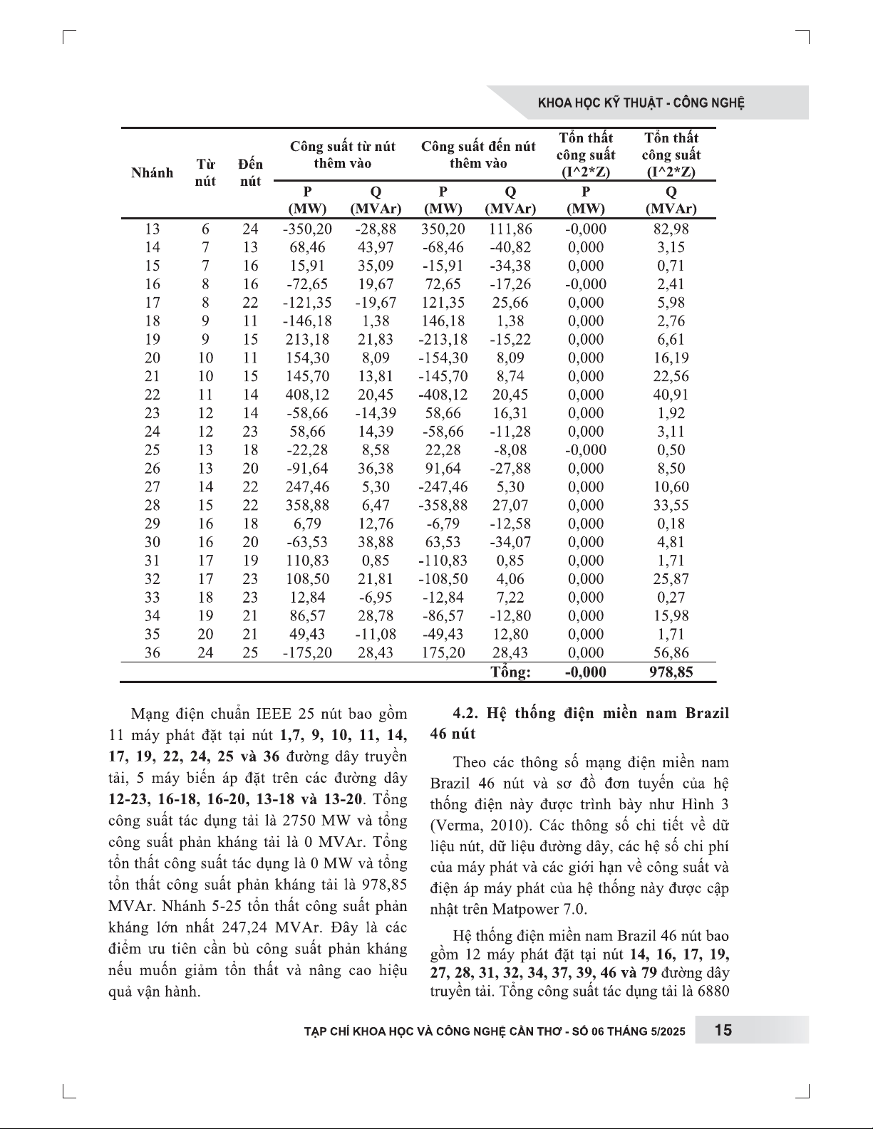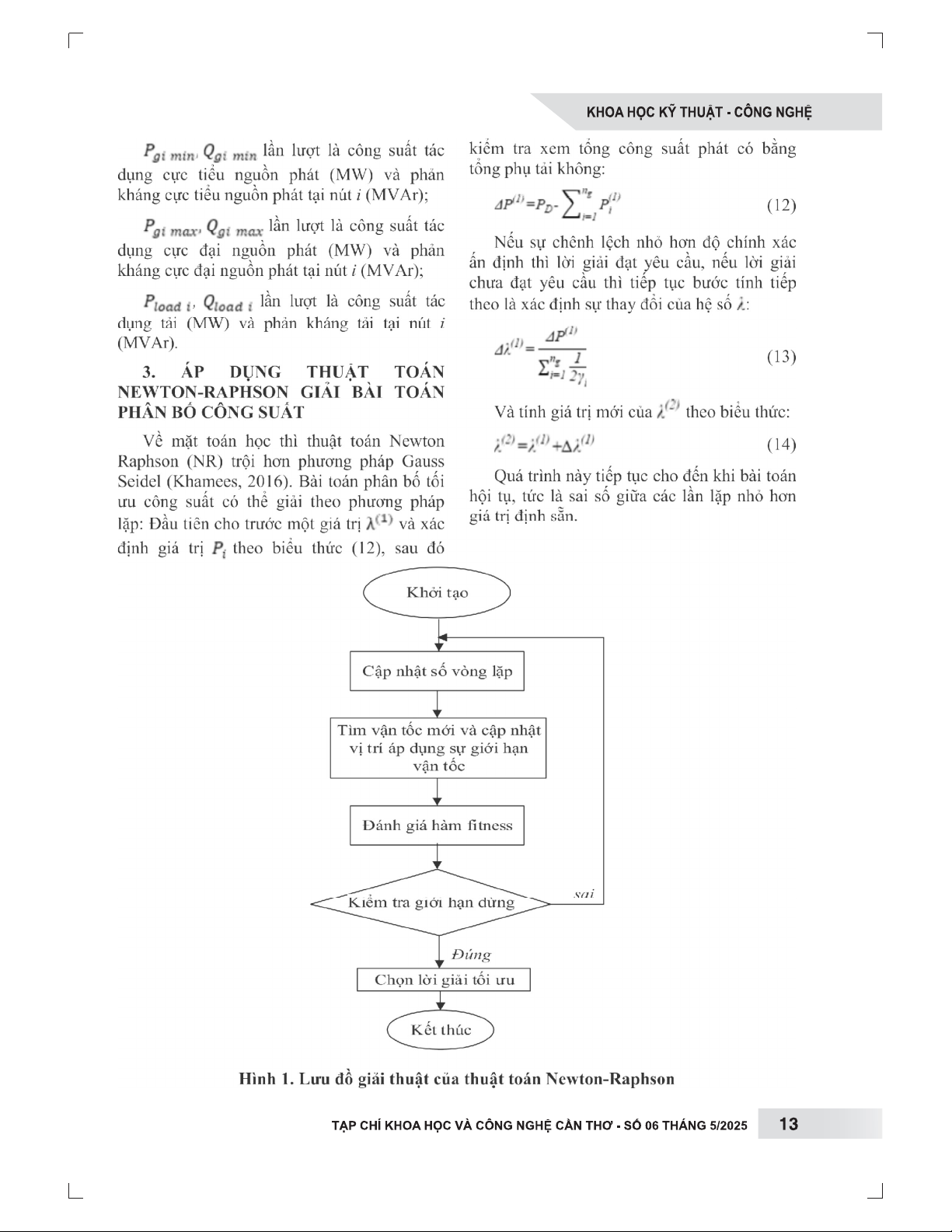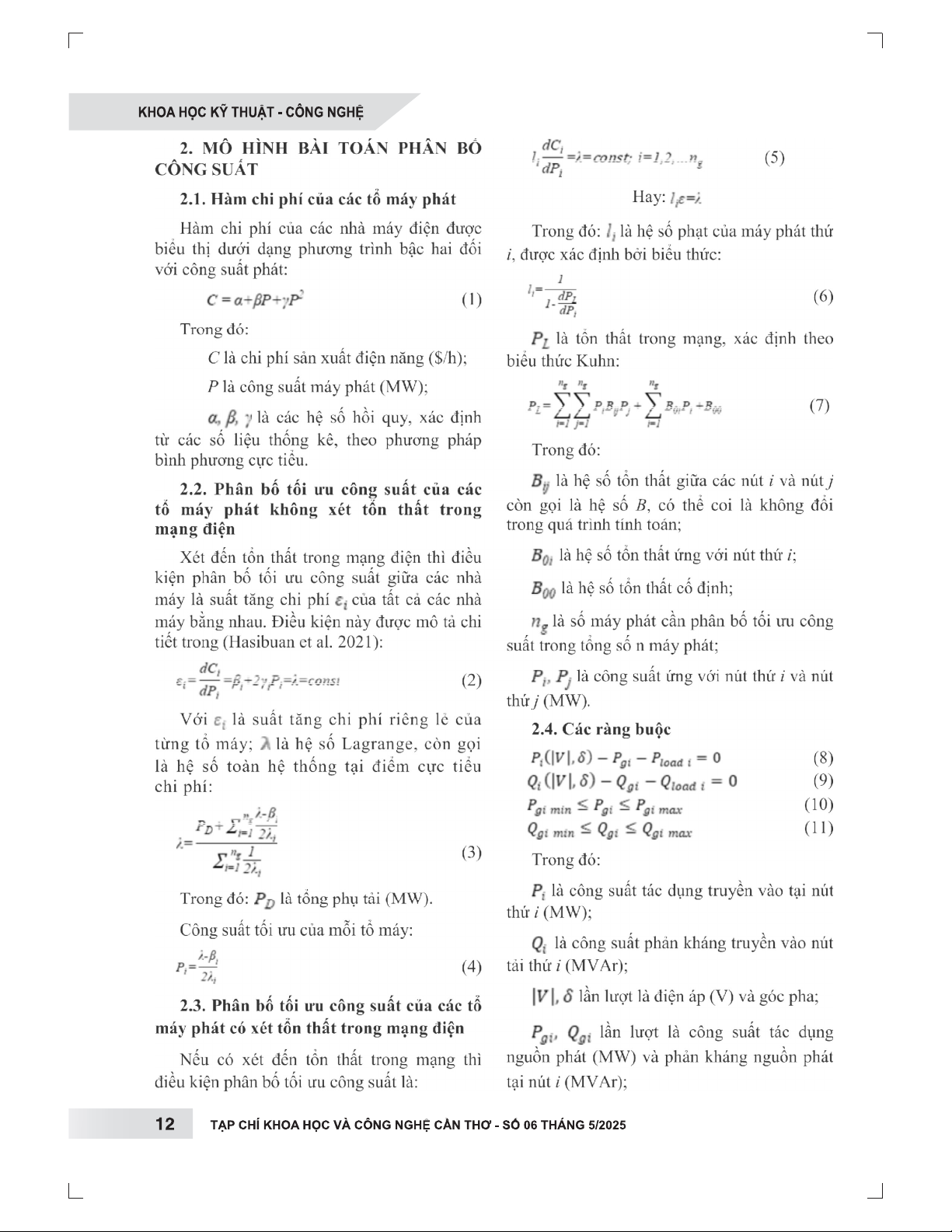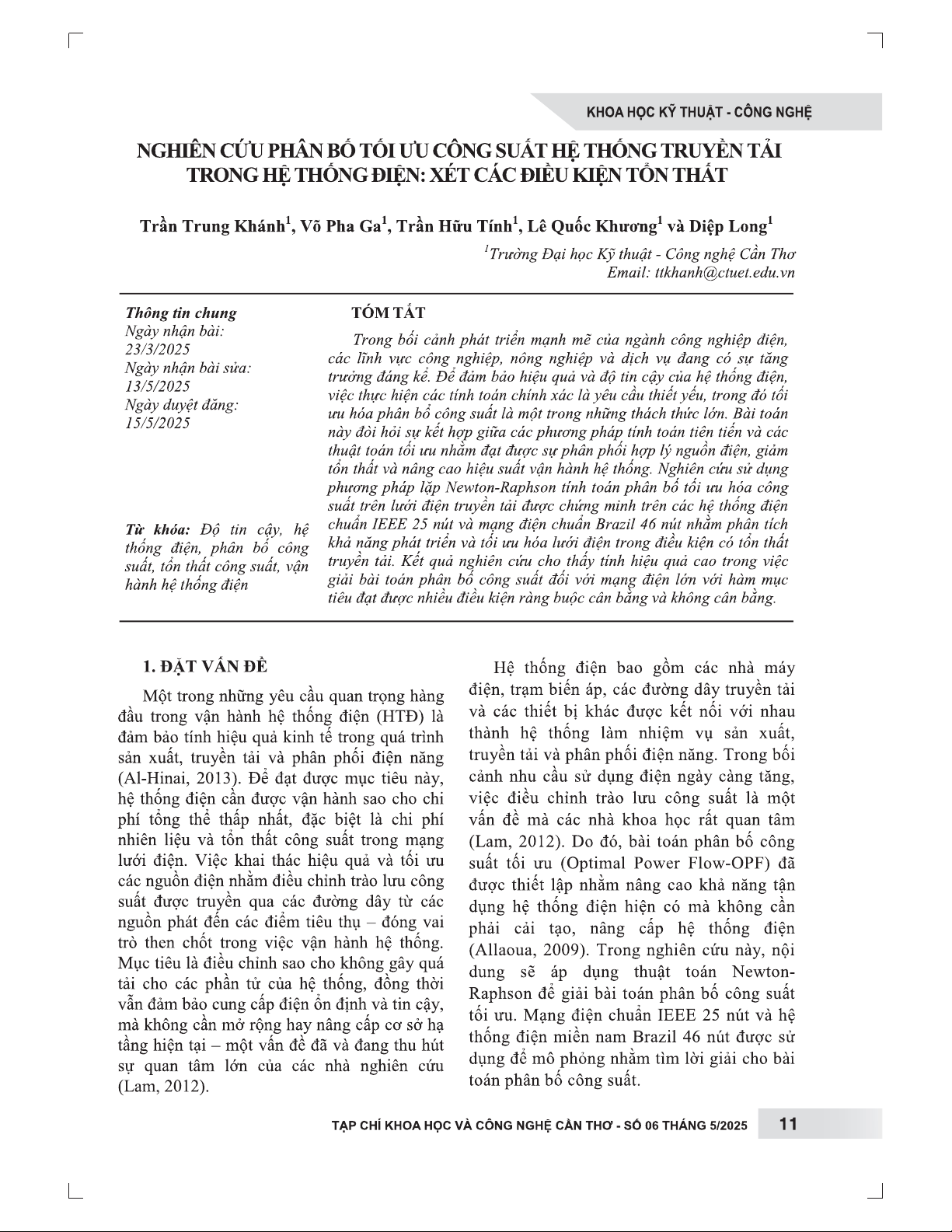 Nghiên cứu này tập trung vào việc nghiên cứu phân bố tối ưu công suất trong hệ thống truyền tải điện, có xét đến các điều kiện tổn thất công suất, nhằm đáp ứng yêu cầu ngày càng cao về hiệu quả và độ tin cậy của ngành điện. Bài toán phân bố công suất được giải quyết bằng việc áp dụng phương pháp lặp Newton-Raphson, một thuật toán tối ưu đã được chứng minh về khả năng tính toán phân bố công suất trên lưới điện truyền tải một cách hiệu quả. Phương pháp này kết hợp các tính toán tiên tiến để đạt được sự phân phối hợp lý nguồn điện, qua đó giảm thiểu tổn thất công suất và nâng cao hiệu suất vận hành hệ thống điện. Nghiên cứu đã tiến hành thử nghiệm trên các hệ thống điện chuẩn IEEE 25 nút và mạng điện miền nam Brazil 46 nút, cho thấy tính hiệu quả cao trong việc giải bài toán phân bố công suất đối với mạng điện lớn, với các hàm mục tiêu và điều kiện ràng buộc cân bằng và không cân bằng. Kết quả cũng chỉ ra các nhánh có tổn thất phản kháng lớn cần được bù công suất phản kháng để tối ưu hóa vận hành hệ thống điện, mang lại hàm ý quan trọng cho các nhà điều hành và kỹ sư trong việc nâng cao chất lượng và độ tin cậy của lưới điện.