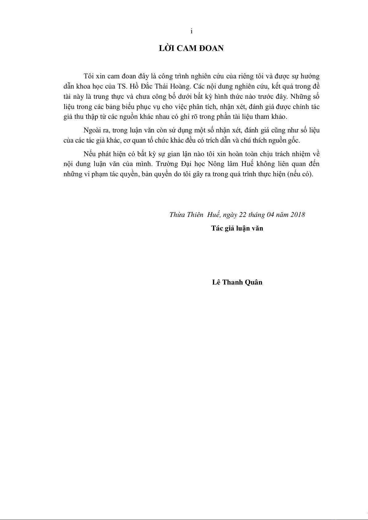 nội dung luận văn của mình. Trường Đại học Nông lâm Huế không liên quan đến