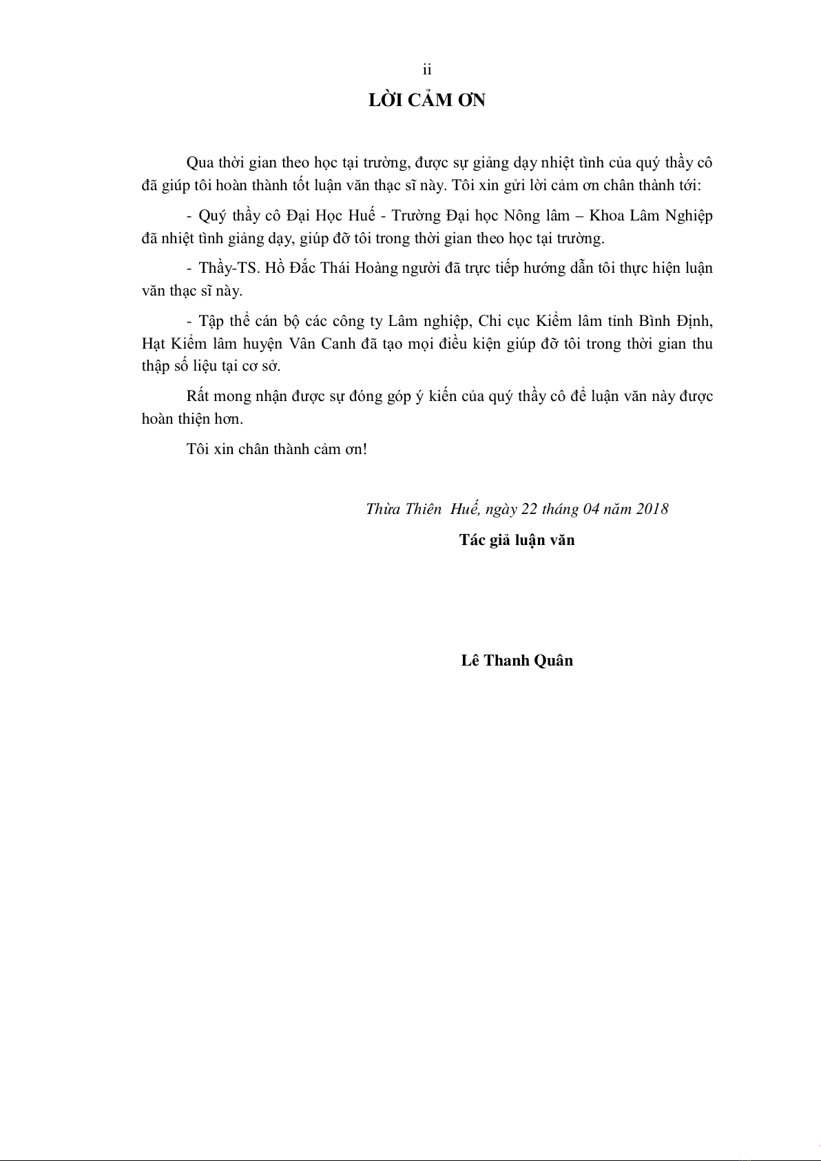 - Quý thầy cô Đại Học Huế - Trường Đại học Nông lâm – Khoa Lâm Nghiệp