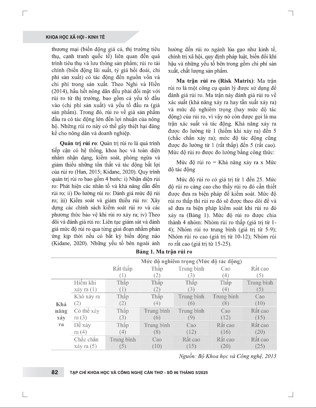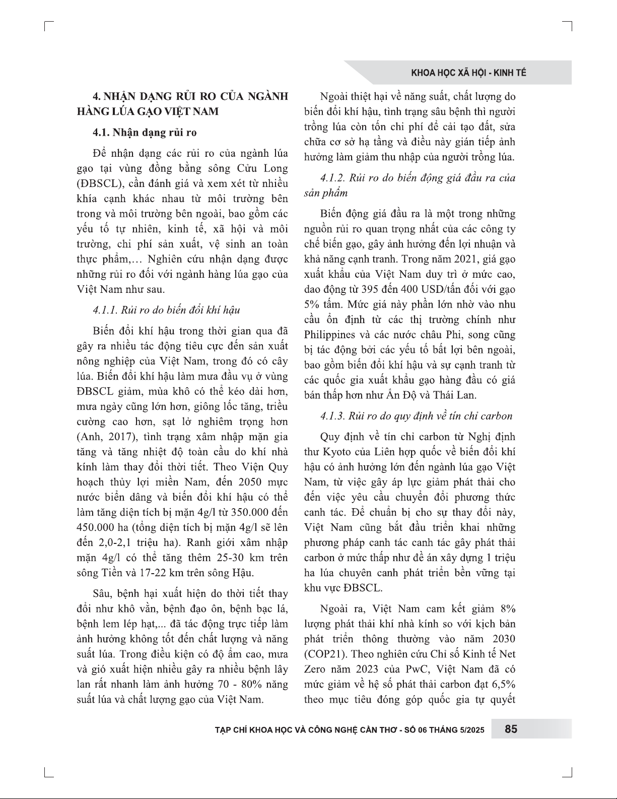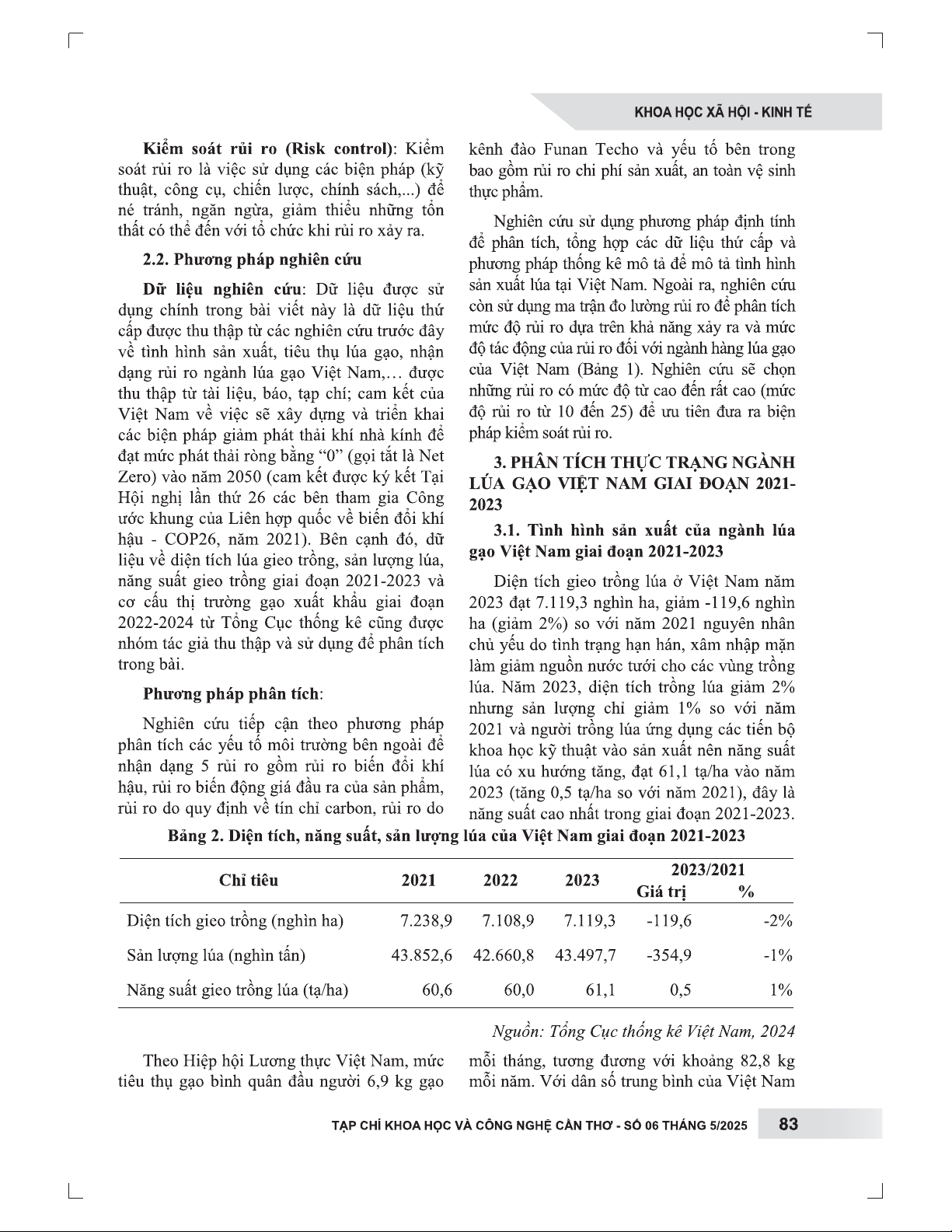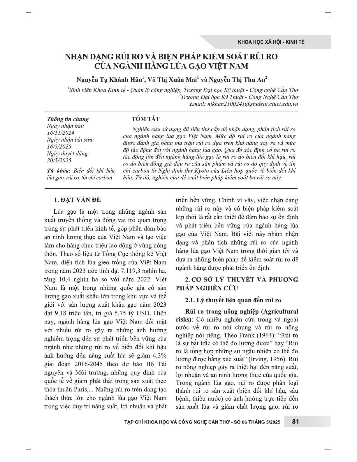 Nghiên cứu này sử dụng phương pháp định tính và thống kê mô tả, phân tích dữ liệu thứ cấp từ nhiều nguồn để nhận diện và đánh giá các rủi ro chính yếu trong ngành lúa gạo Việt Nam giai đoạn 2021-2023. Bằng cách áp dụng ma trận rủi ro, bài viết đánh giá mức độ rủi ro dựa trên khả năng xảy ra và tác động tiềm tàng, từ đó xác định các rủi ro ưu tiên cần kiểm soát. Kết quả phân tích đã chỉ ra ba loại rủi ro có tác động lớn nhất đến ngành lúa gạo: rủi ro do biến đổi khí hậu (ảnh hưởng đến năng suất), rủi ro từ biến động giá đầu ra của sản phẩm (ảnh hưởng đến lợi nhuận và khả năng cạnh tranh), và rủi ro từ các quy định về tín chỉ carbon (liên quan đến giảm phát thải và chi phí sản xuất). Bên cạnh đó, nghiên cứu còn đề cập đến các rủi ro khác như kênh đào Funan Techo và các quy định về vệ sinh an toàn thực phẩm. Để đối phó với những thách thức này, bài viết đề xuất các biện pháp kiểm soát rủi ro chiến lược, giúp ngành lúa gạo của Việt Nam duy trì sự ổn định, nâng cao năng lực cạnh tranh và phát triển bền vững. Nghiên cứu cung cấp cái nhìn tổng thể và những khuyến nghị thiết thực cho các nhà hoạch định chính sách và doanh nghiệp trong ngành.