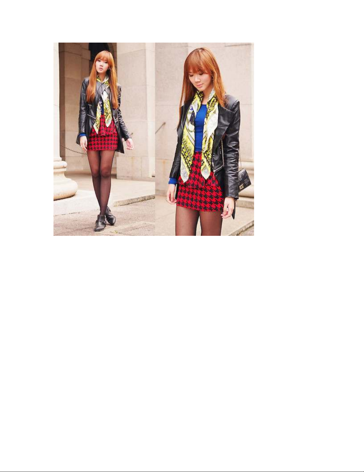 houndstooth đang rất hot hin nay. Khi phối cùng áo trong xanh sm và khăn