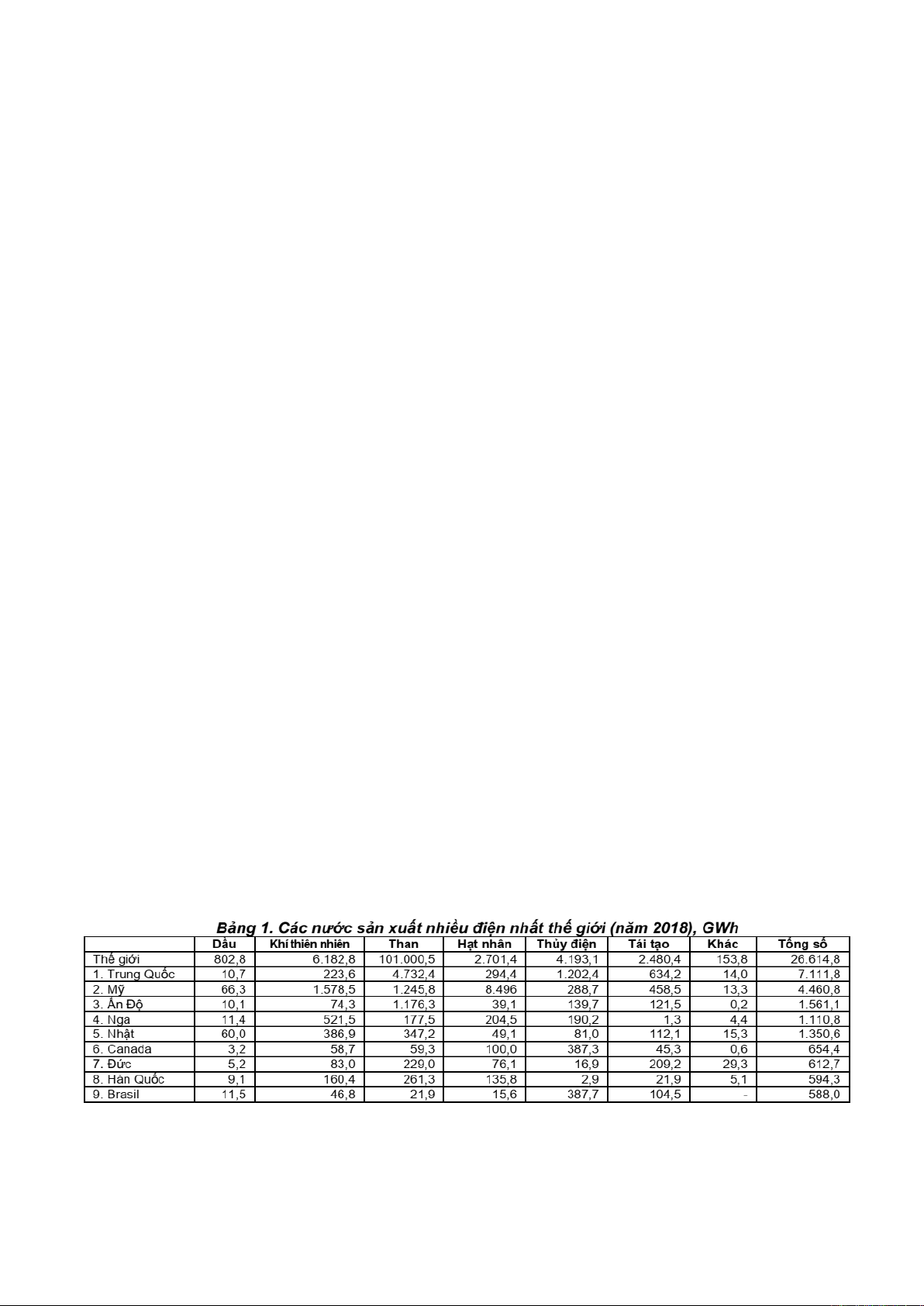 Tỉ trọng sản xuất điện từ các nguồn khác nhau của các nhà máy điện ở một số quốc gia trên thế giới
