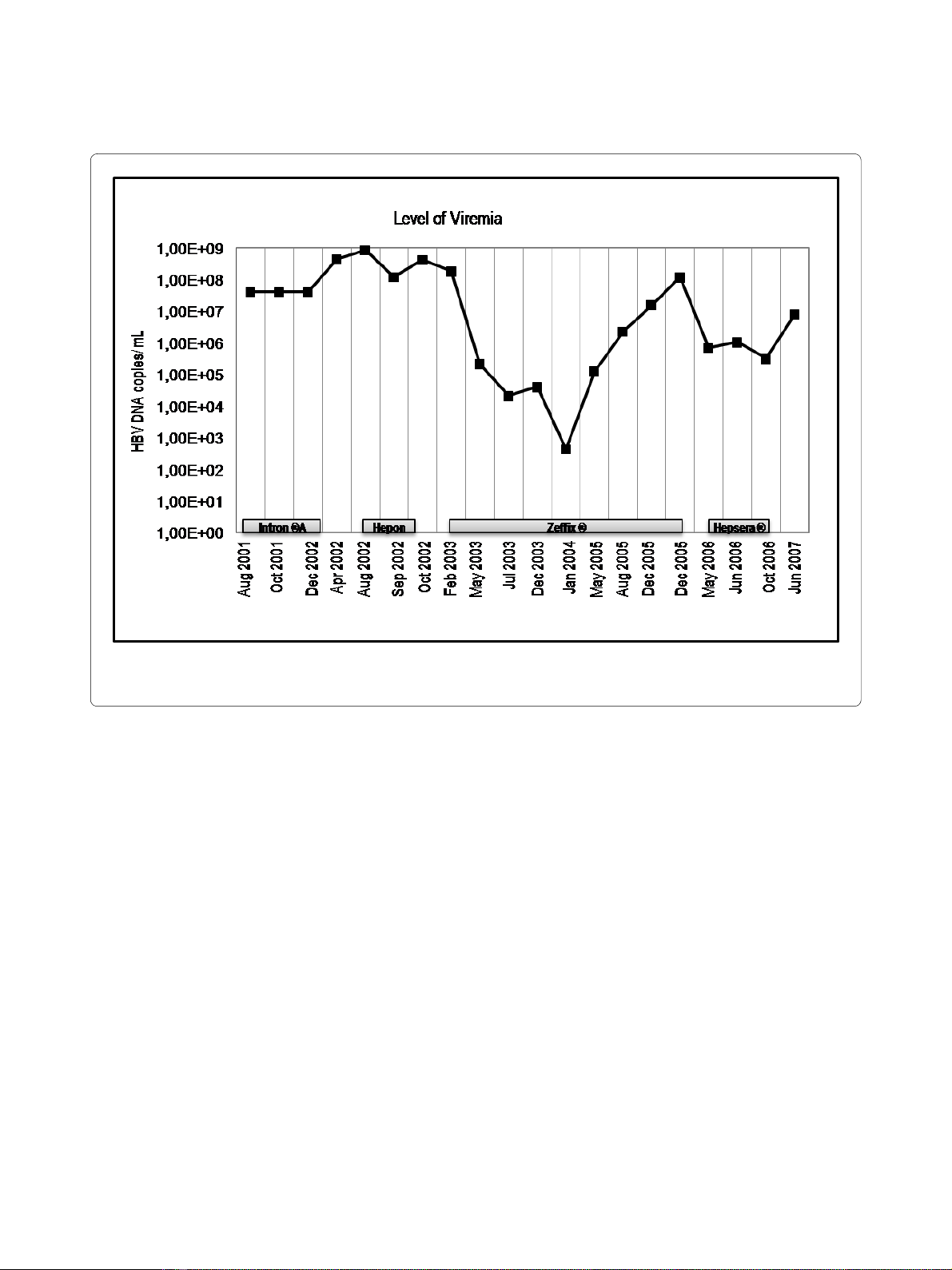 Figure 1 Level of viremia in a patient receiving Interferon, Hepon, Lamivudine and Adefovir. The levels of viremia were measured by PCR-