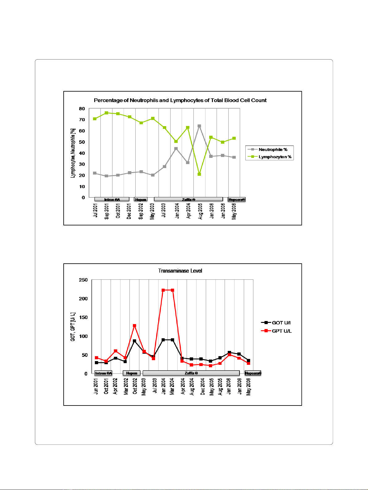 Figure 2 a. Level of neutrophiles and lymphocytes during CHB treatment with interferon, hepon, lamivudine and adefovir dipivoxil. b. Lev-