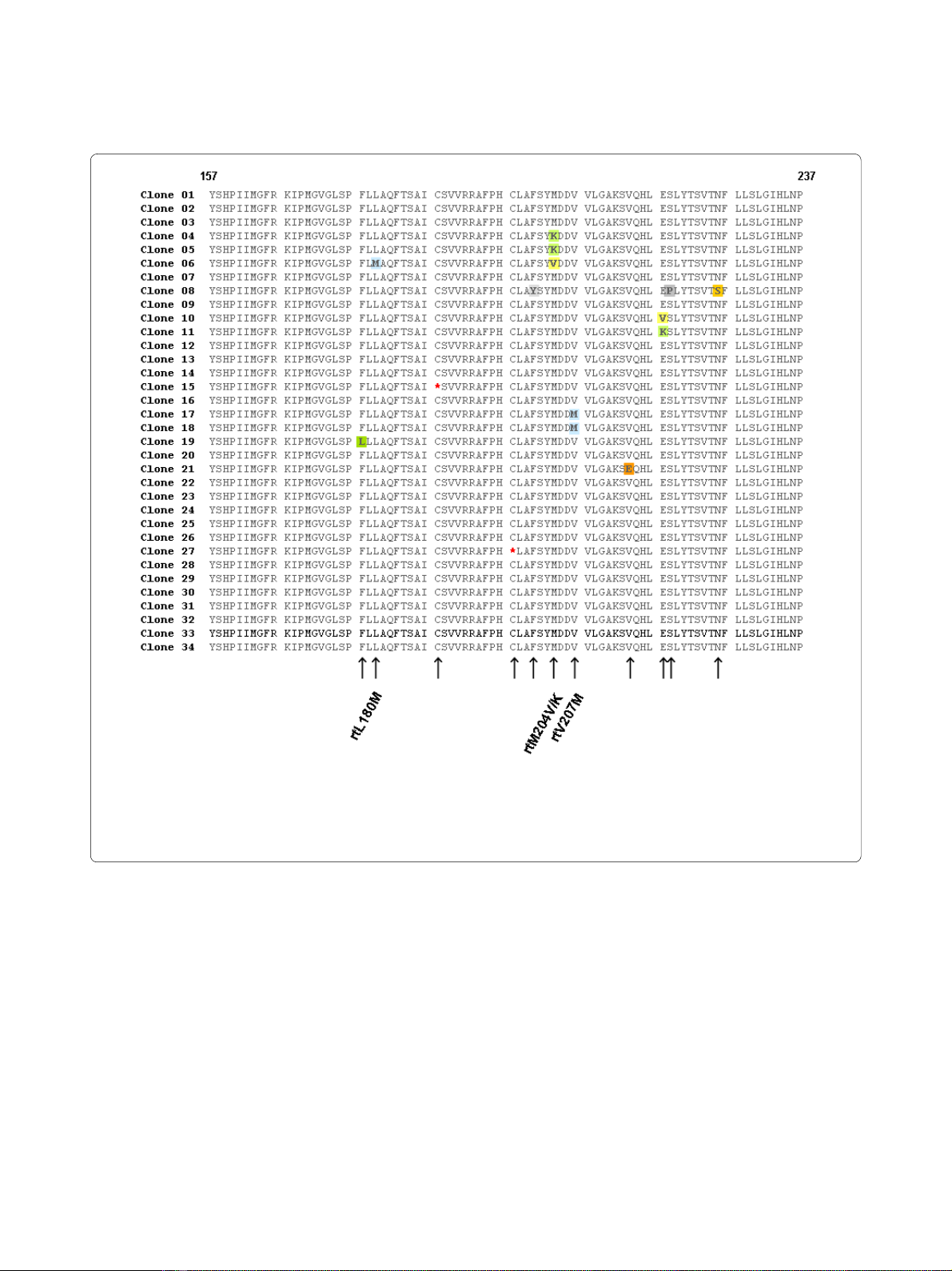 Figure 3 Alignment of quasispecies analysis. Sequence of amino acids 157 - 237 in the reverse transcriptase domain of HBV polymerase is shown.