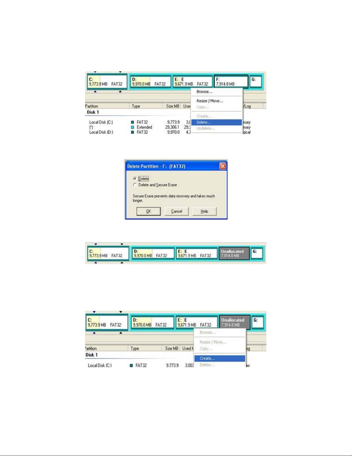 Thí dụ : xoá ổ F đi và tạo lại thành 2 ổ khác ta làm như sau :