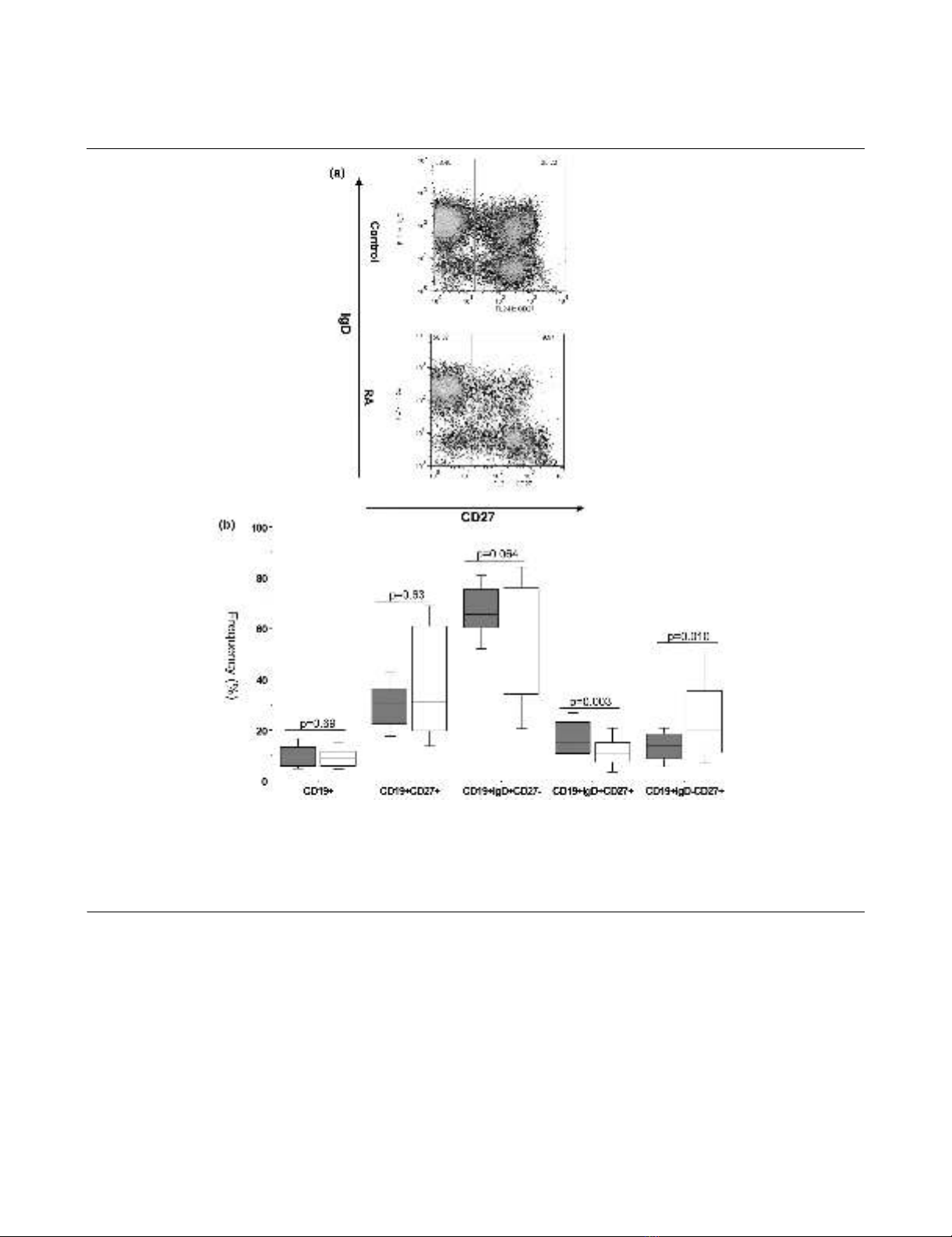 CD27 of peripheral blood CD19+ B cells from representative healthy control and a long-standing rheumatoid arthritis (RA) patients illustrating the