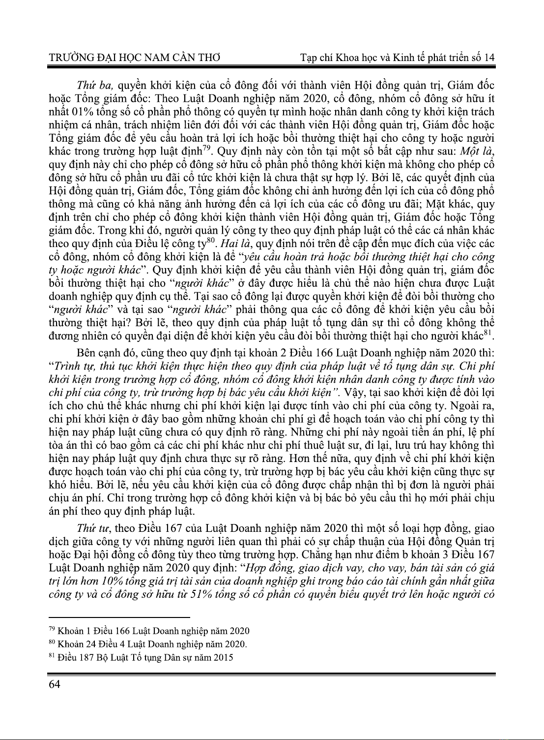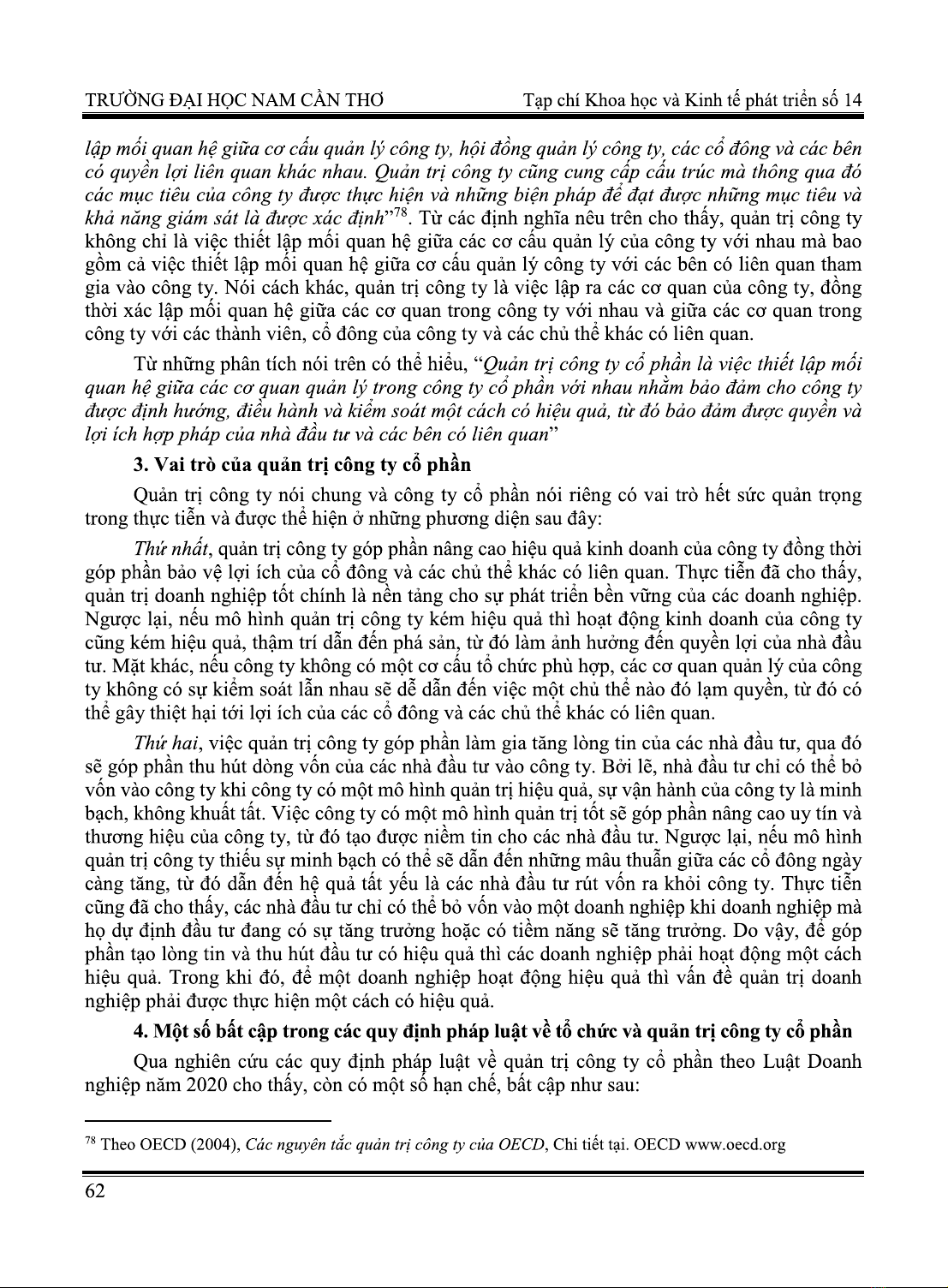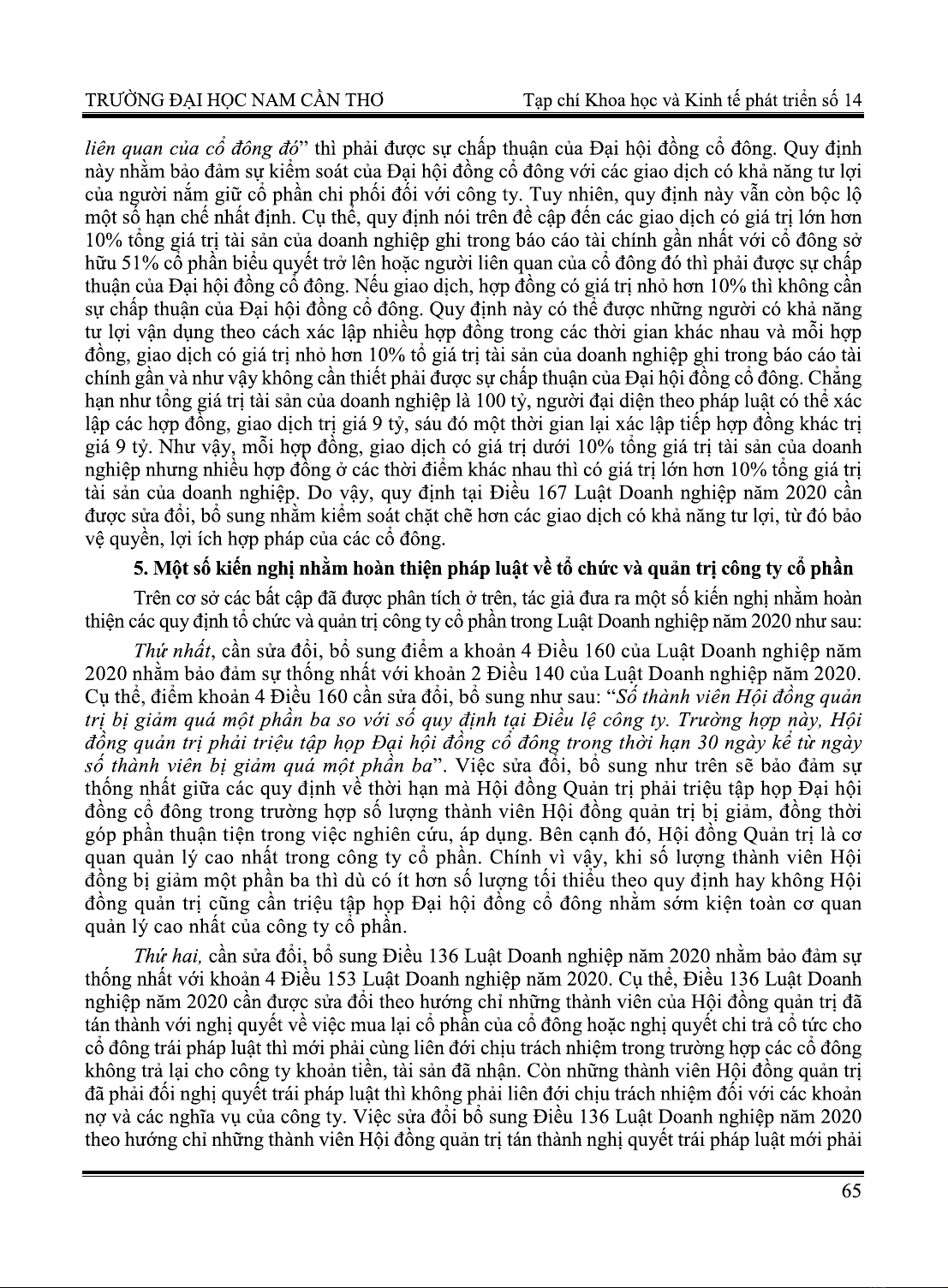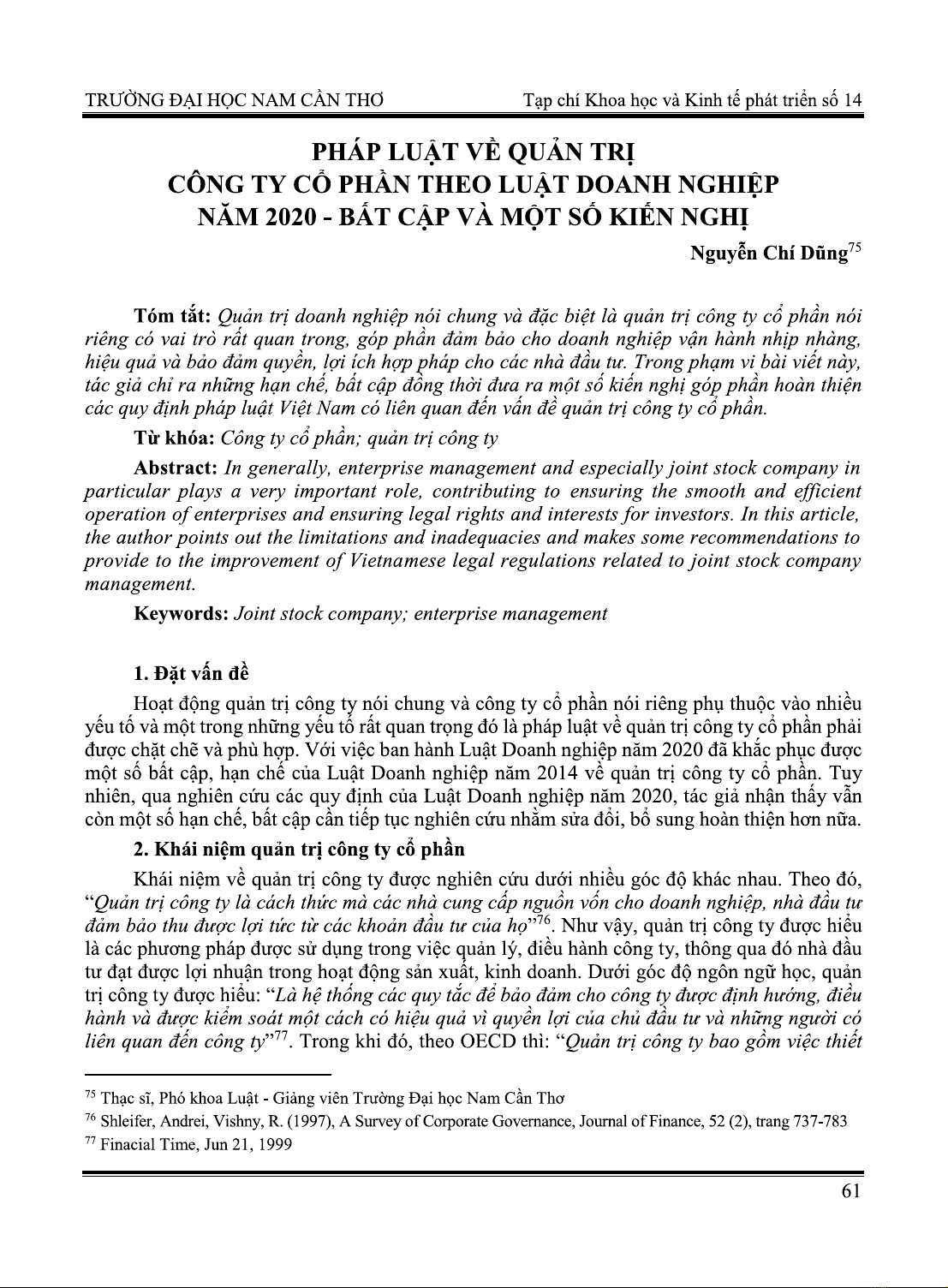 Trong bài viết "Pháp luật về quản trị công ty cổ phần theo Luật Doanh nghiệp năm 2020 – Bất cập và một số kiến nghị" tác giả chỉ ra những hạn chế, bất cập và đưa ra một số kiến nghị nhằm hoàn thiện các quy định pháp luật Việt Nam liên quan đến quản lý công ty cổ phần.