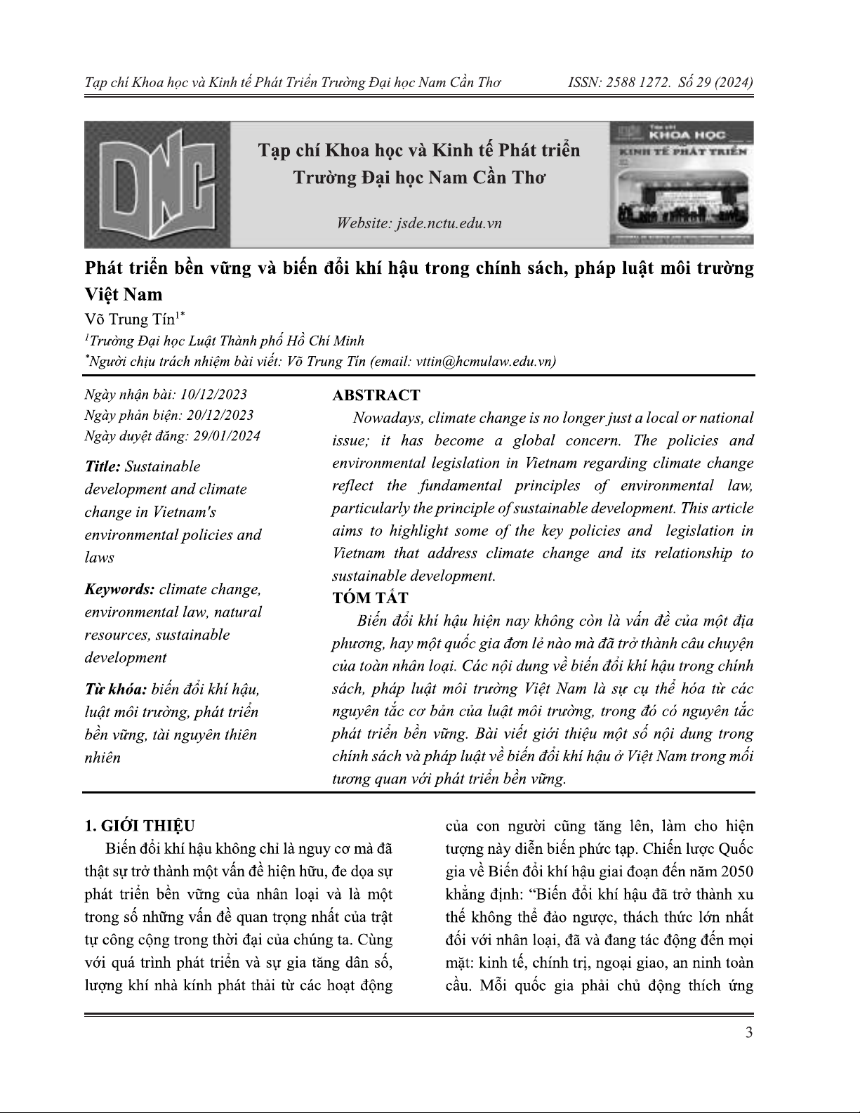Biến đổi khí hậu hiện nay không còn là vấn đề của một địa phương, hay một quốc gia đơn lẻ nào mà đã trở thành câu chuyện của toàn nhân loại. Các nội dung về biến đổi khí hậu trong chính sách, pháp luật môi trường Việt Nam là sự cụ thể hóa từ các nguyên tắc cơ bản của luật môi trường, trong đó có nguyên tắc phát triển bền vững. Bài viết giới thiệu một số nội dung trong chính sách và pháp luật về biến đổi khi hậu ở Việt Nam trong mối tương quan với phát triển bền vững.