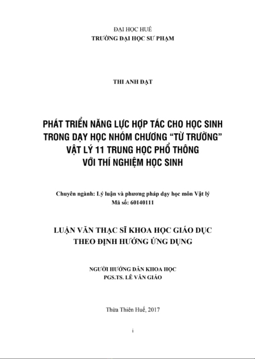 Đề tài "Phát triển năng lực hợp tác cho học sinh trong dạy học nhóm chương Từ trường Vật lý 11 trung học phổ thông với thí nghiệm học sinh" đề xuất được biện pháp và quy trình tổ chức dạy học nhóm với sự hỗ trợ của thí nghiệm học sinh theo định hướng phát triển năng lực hợp tác cho học sinh và vận dụng vào dạy học chương Từ trường Vật lý 11 THPT.