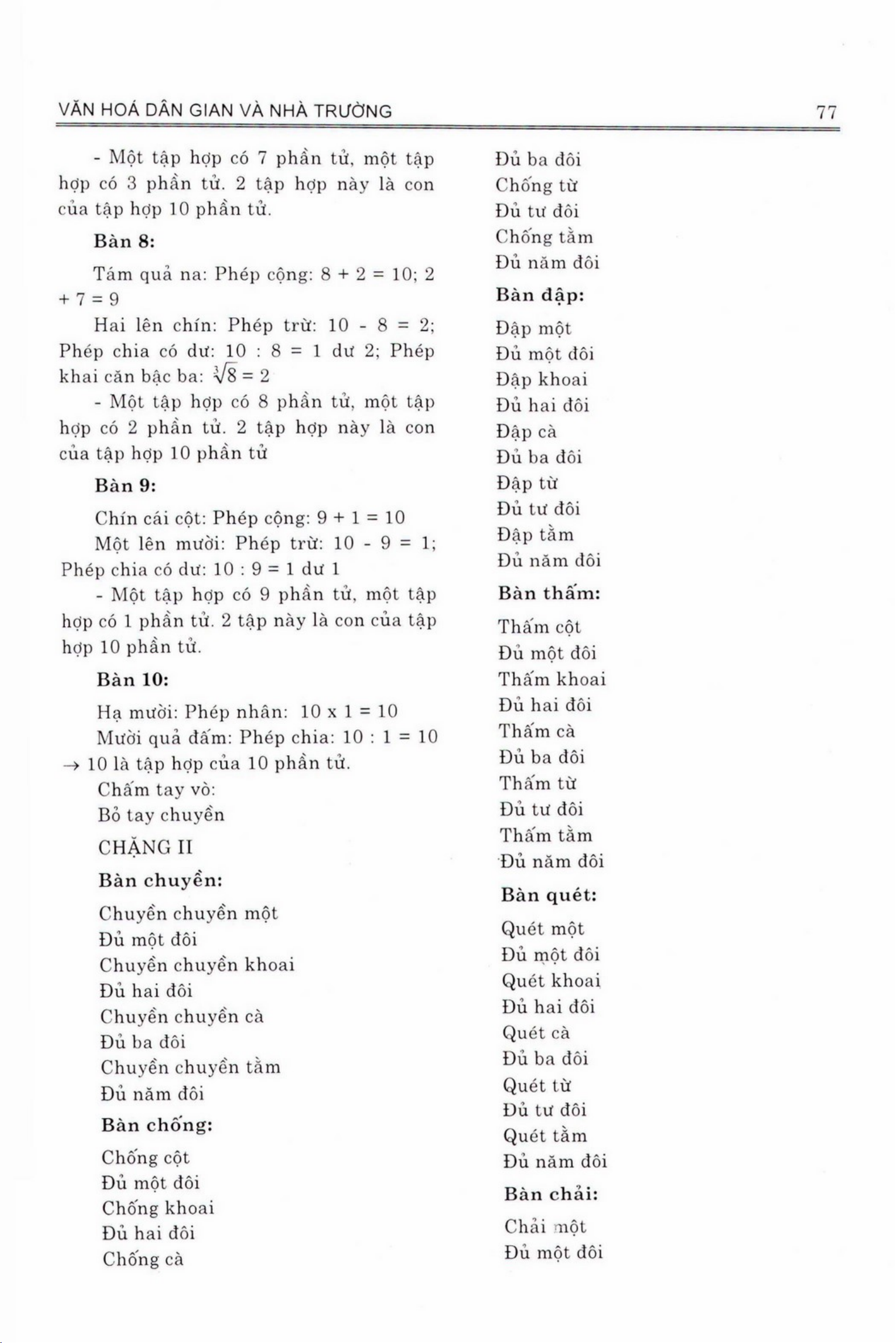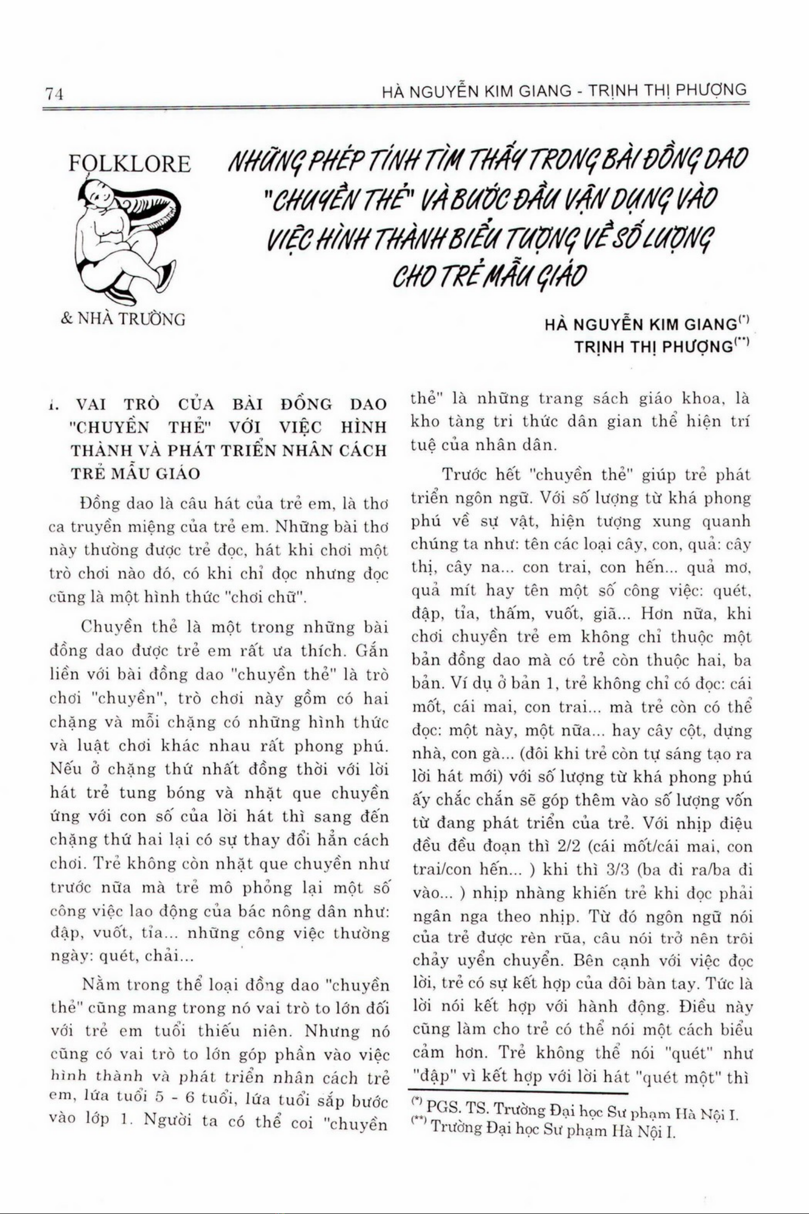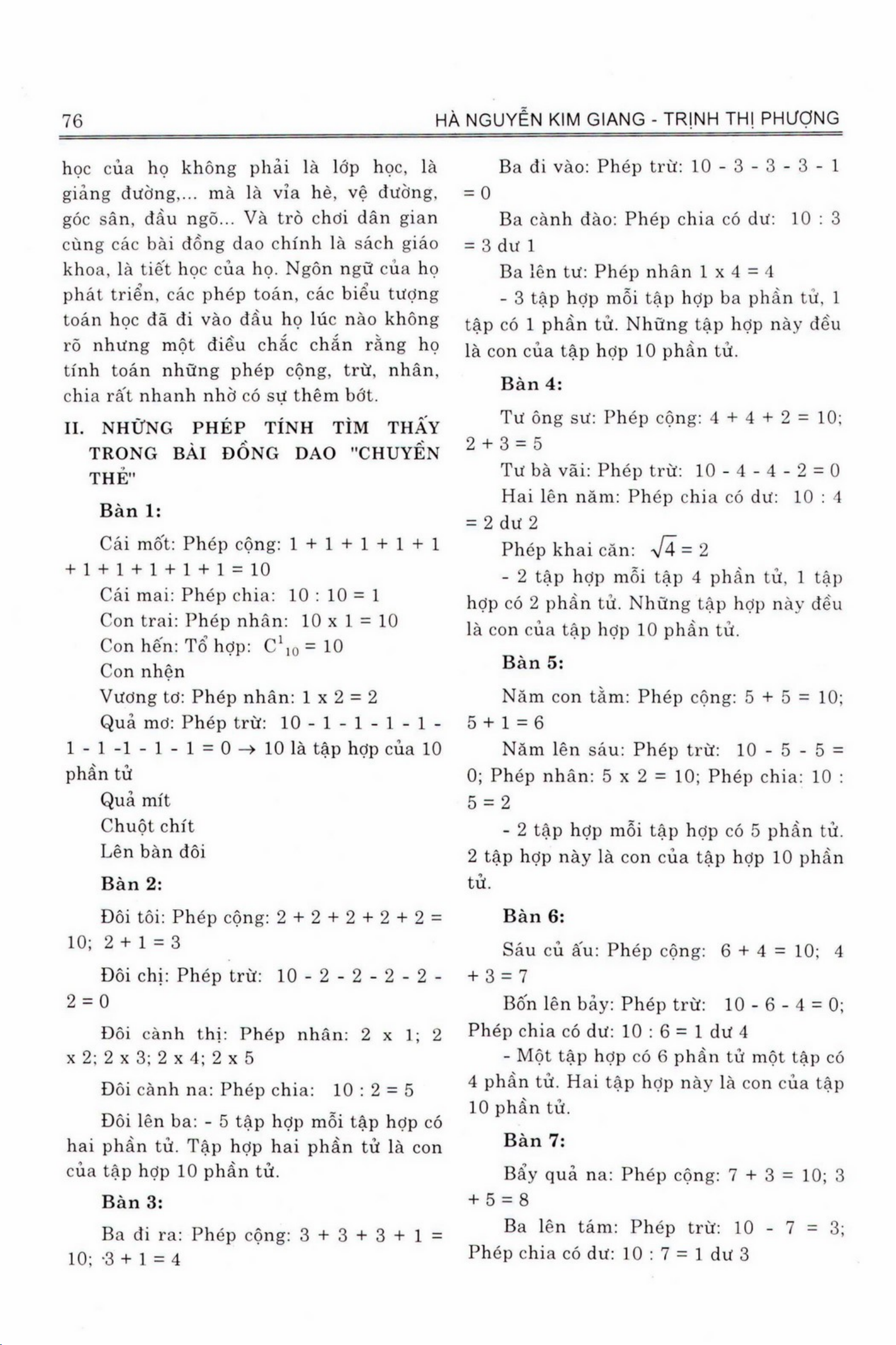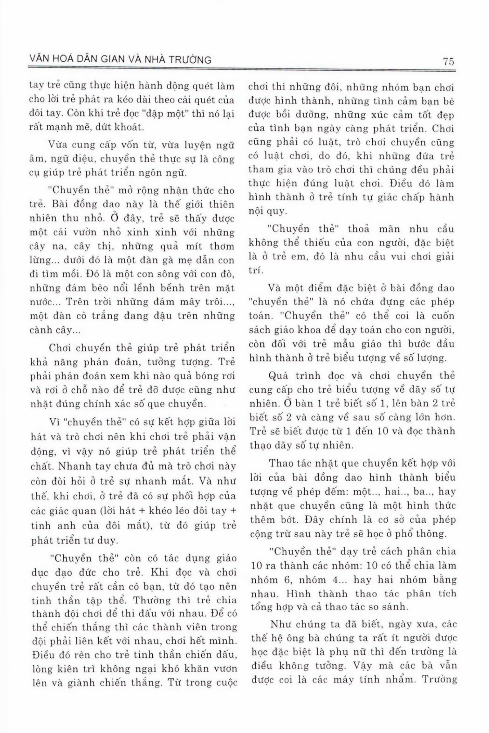 Bài đồng dao là một loại trò chơi dân gian phổ biến, nhưng có thể không được coi như một cách hữu ích cho việc giáo dục. Tuy nhiên, bài viết này chỉ ra rõ rằng bài đồng dao có thể giúp trẻ tiếp cận vào các khái niệm toán học dễ dàng bằng cách sử dụng những phép tính đơn giản mà không yêu cầu nhiều kiến thức chuyên sâu. Bài viết đưa ra ví dụ về những phép tính thú vị trong bài đồng dao, và cho biết cách sử dụng chúng cho quá trình giáo dục. Bài viết nói rằng, bài đồng dao có thể giúp phát triển khả năng nhận thức và tư duy logic cho trẻ, vì các phép tính trong bài đồng dao yêu cầu sự hoạt động tư duy của người chơi. Bài viết nói rằng, việc sử dụng bài đồng dao cho giáo dục có thể là một cách tốt để khởi đầu quá trình học tập cho trẻ.