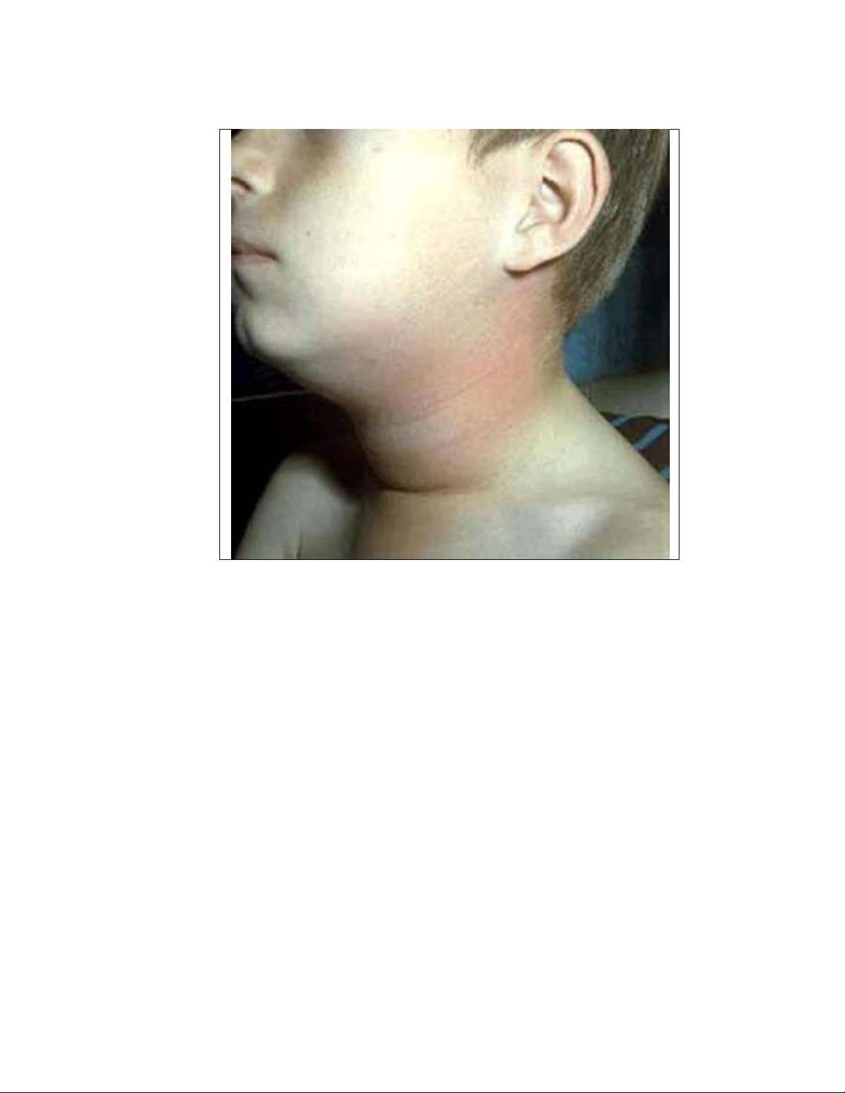 rãnh trước và sau tai, có khi biến dạng mặt, mặt phình ra, cổ bạnh, cằm