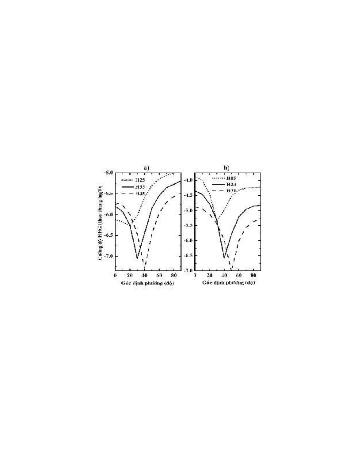 góc định phương khác nhau, chúng tôi biểu diễn sự phụ thuộc của cường độ sóng HHG