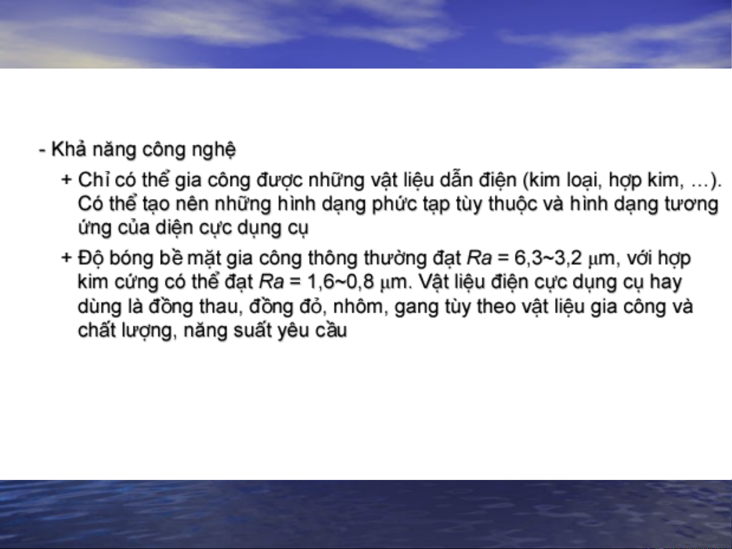Các tiến bộ về WEDM ngày nay đã cho phép gia công các vật liệu này mà không bị xoắn hay ba via. Ngay cả vật liệu sứ cách điện cũng có thể được gia công bằng phương pháp này. Hiện nay, việc nghiên cứu gia công sứ cách điện vẫn đang được nghiên cứu và triển khai áp dụng rộng rãi trên nhiều nơi trên thế giới, nhất là ở các trường đại học.