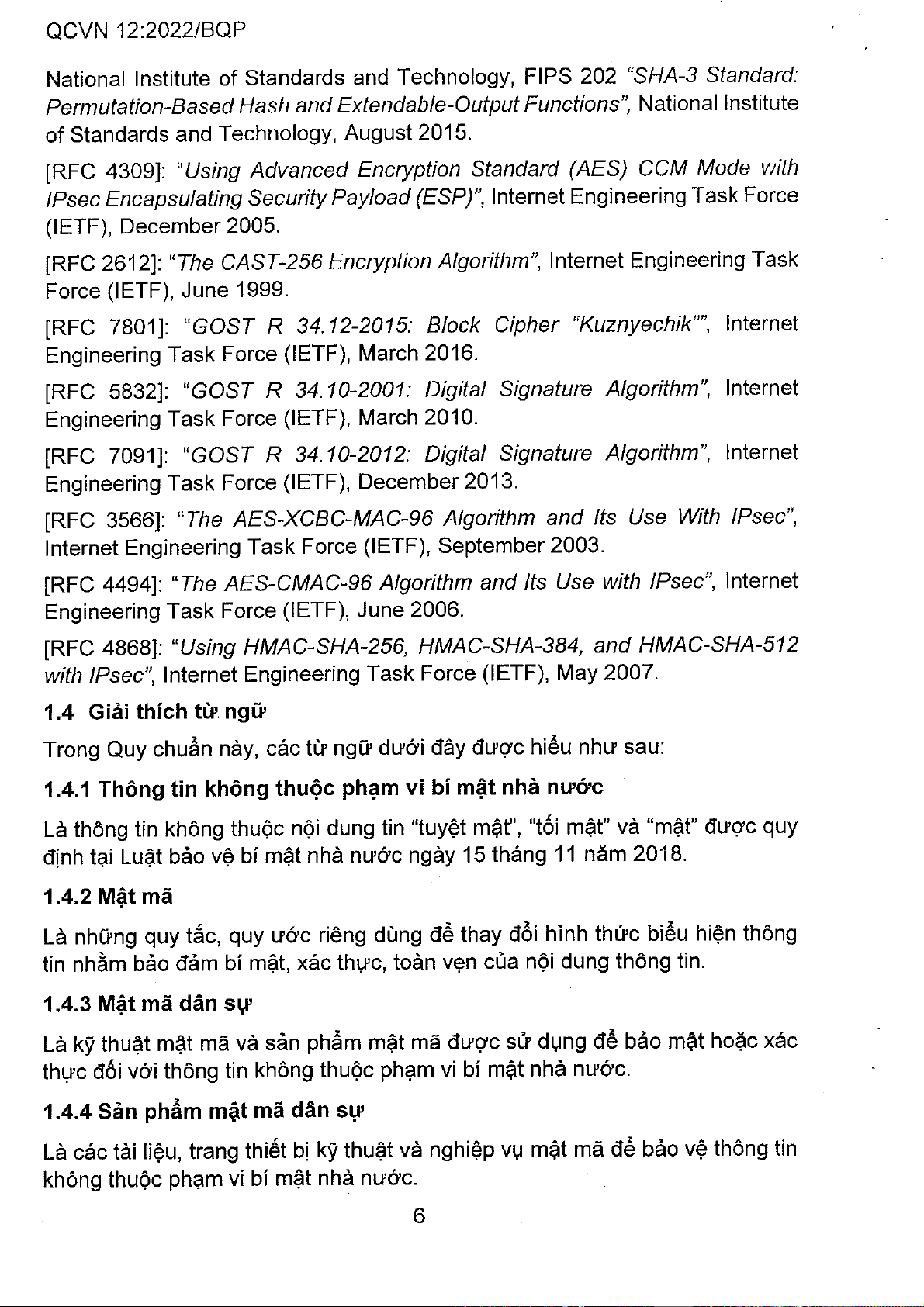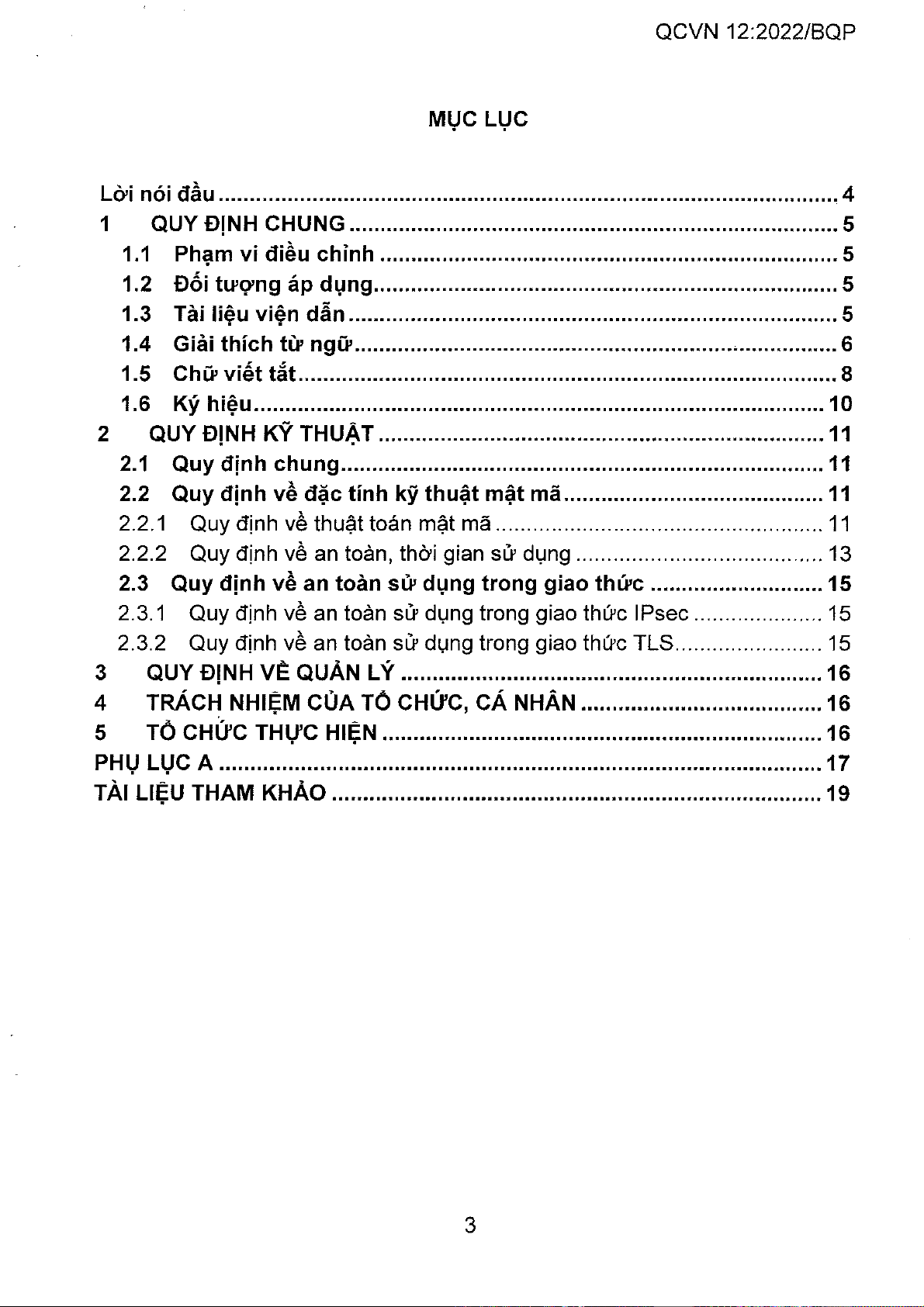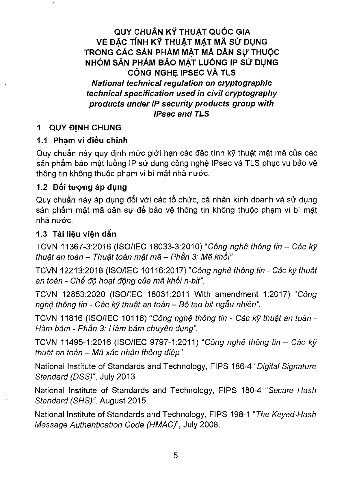 Quy chuẩn kỹ thuật quốc gia QCVN 12:2022/BQP quy định chi tiết về đặc tính kỹ thuật mật mã áp dụng cho các sản phẩm mật mã dân sự thuộc nhóm sản phẩm bảo mật luồng IP, đặc biệt là khi sử dụng công nghệ IPsec và TLS. Tài liệu này cung cấp một khuôn khổ toàn diện, từ phạm vi điều chỉnh, đối tượng áp dụng cho đến các quy định kỹ thuật cụ thể. Về nội dung chính, Quy chuẩn này xác định rõ các thuật toán mật mã được phép sử dụng, bao gồm các tiêu chuẩn cho mã hóa, hàm băm, thuật toán chữ ký số và các chế độ hoạt động an toàn. Nó cũng đề cập đến các yêu cầu về an toàn và thời gian sử dụng đối với các thuật toán này, đồng thời đưa ra các quy định chi tiết về an toàn khi triển khai trong các giao thức IPsec và TLS, là hai giao thức nền tảng cho việc bảo vệ dữ liệu truyền tải trên mạng IP. Phương pháp tiếp cận của Quy chuẩn dựa trên việc viện dẫn các tiêu chuẩn quốc gia (TCVN) và quốc tế (FIPS, RFC) đã được công nhận, đảm bảo tính cập nhật và tương thích. Giá trị ứng dụng và hàm ý của QCVN 12:2022/BQP là rất lớn. Nó cung cấp một nền tảng pháp lý và kỹ thuật vững chắc để đánh giá, kiểm định và triển khai các sản phẩm mật mã dân sự tại Việt Nam, qua đó nâng cao chất lượng và độ tin cậy của các giải pháp an ninh mạng. Việc tuân thủ quy chuẩn này giúp các tổ chức và cá nhân bảo vệ hiệu quả thông tin không thuộc phạm vi bí mật nhà nước, giảm thiểu rủi ro từ các cuộc tấn công mạng và đảm bảo an toàn giao dịch điện tử. Điều này củng cố niềm tin vào hạ tầng số quốc gia và thúc đẩy phát triển kinh tế số an toàn.