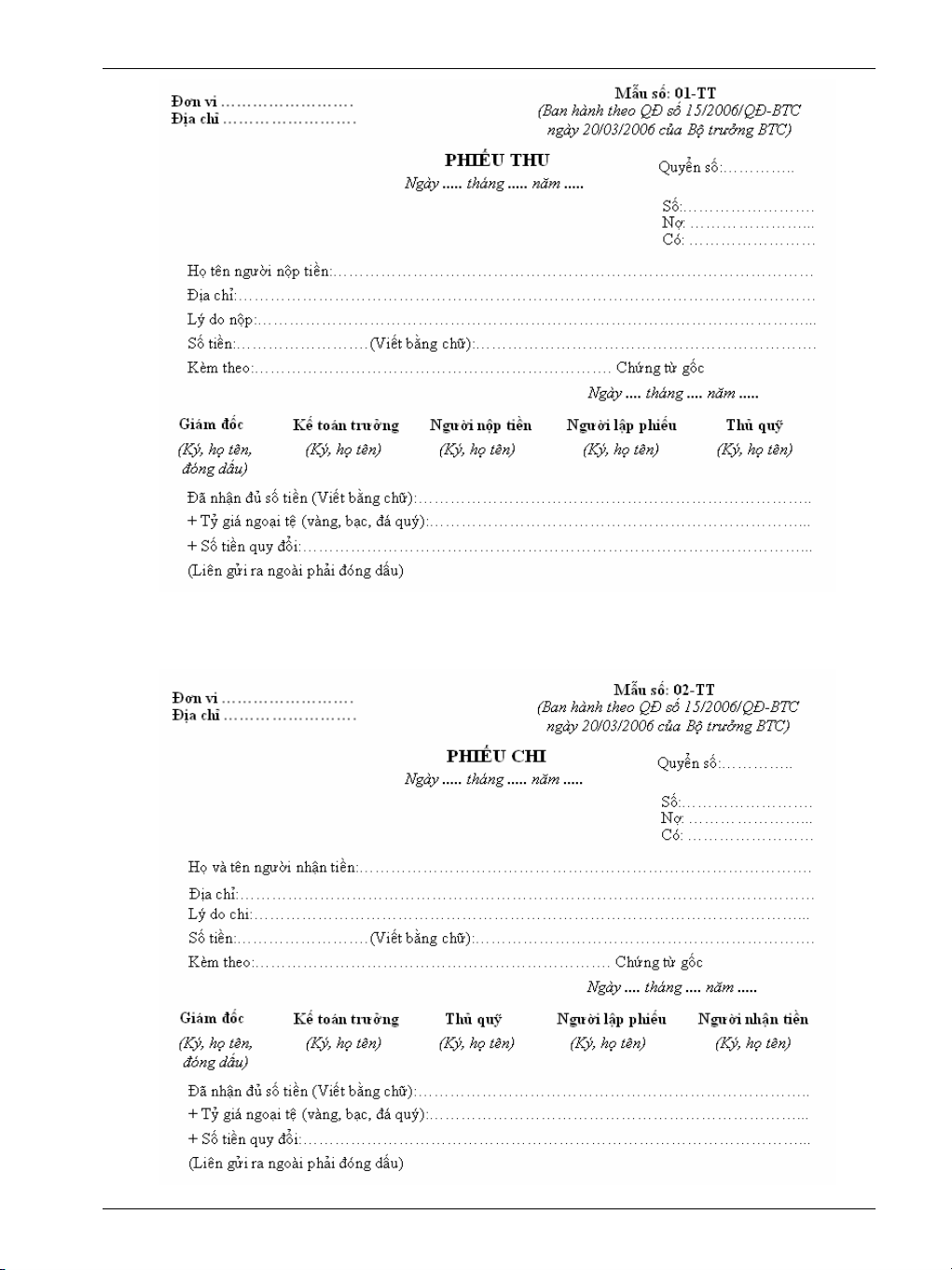 - Các chứng từ gốc liên quan đến việc thu chi tiền mặt: Phiếu thu; Phiếu