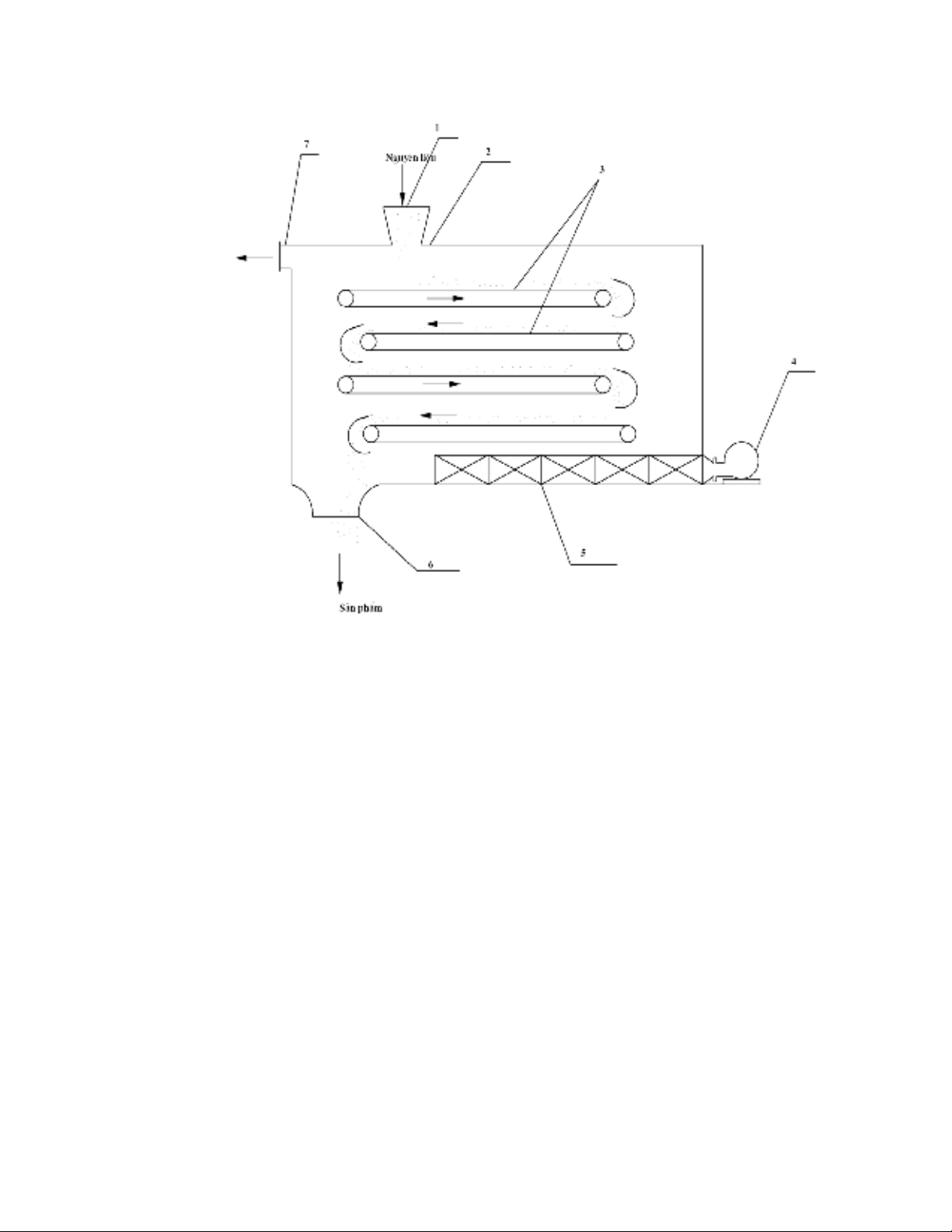 ngoµi ra cöa 7. S¶n phÈm sÊy ®−îc tho¸t ra ngoµi qua cöa 6. Do nguyªn liÖu