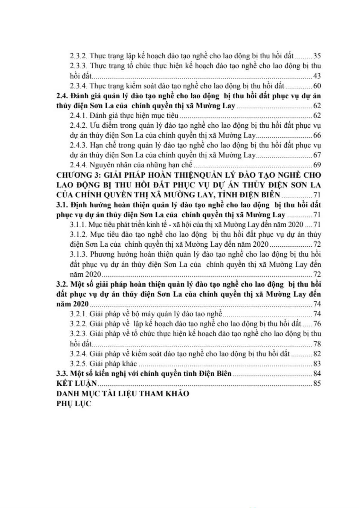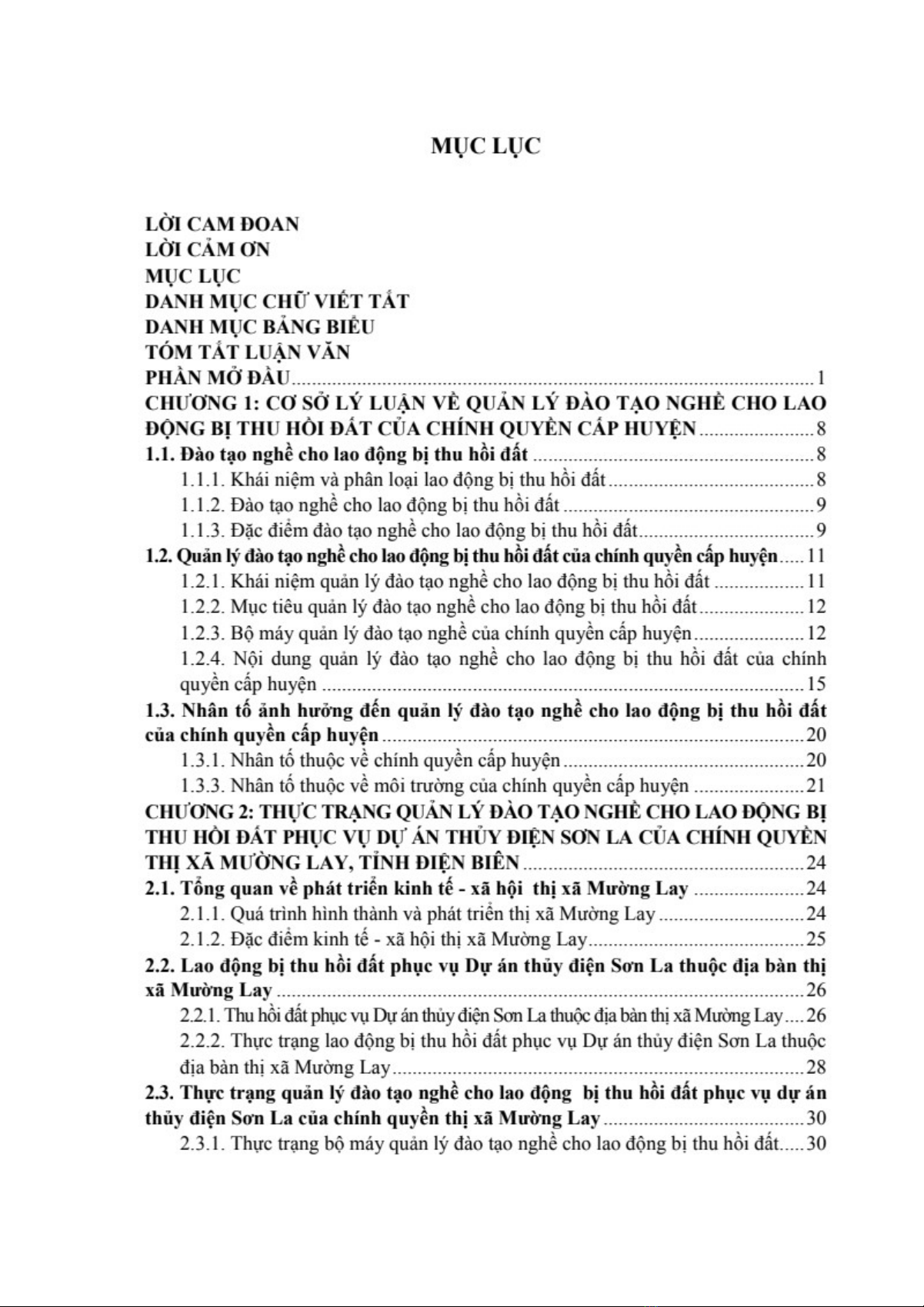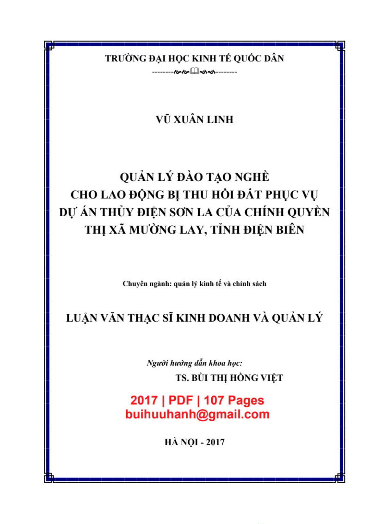 Luận văn Quản lý kinh tế: Quản lý đào tạo nghề cho lao động bị thu hồi đất phục vụ dự án thủy điện Sơn La của chính quyền thị xã Mường Lay, tỉnh Điện Biên là một nghiên cứu về việc quản lý đào tạo nghề cho lao động bị thu hồi đất, để phục vụ dự án thủy điện Sơn La của chính quyền thị xã Mường Lay, tỉnh Điện Biên. Trong nghiên cứu này, đã phân tích cơ sở lý luận về quản lý đào tạo nghề cho lao động bị thu hồi đất của chính quyền cấp huyện và thực trạng quản lý đào tạo nghề cho lao động bị thu hồi đất của chính quyền thị xã Mương Lay, tỉnh Điện Biên. Kết quả nghiên cứu đã chỉ ra rằng để hoàn thiện việc quản lý đào tạo nghề cho lao động bị thu hồi đất, cần phải phát triển chương trình đào tạo nghề phù hợp với nhu cầu của lao động, tăng cường sự tham gia của các tổ chức phi chính phủ và cộng đồng trong quá trình đào tạo, và xây dựng hệ thống đánh giá hiệu quả đào tạo. Nghiên cứu này hy vọng sẽ cung cấp những đóng góp mới cho việc quản lý đào tạo nghề cho lao động bị thu hồi đất và phát triển kinh tế địa phương.