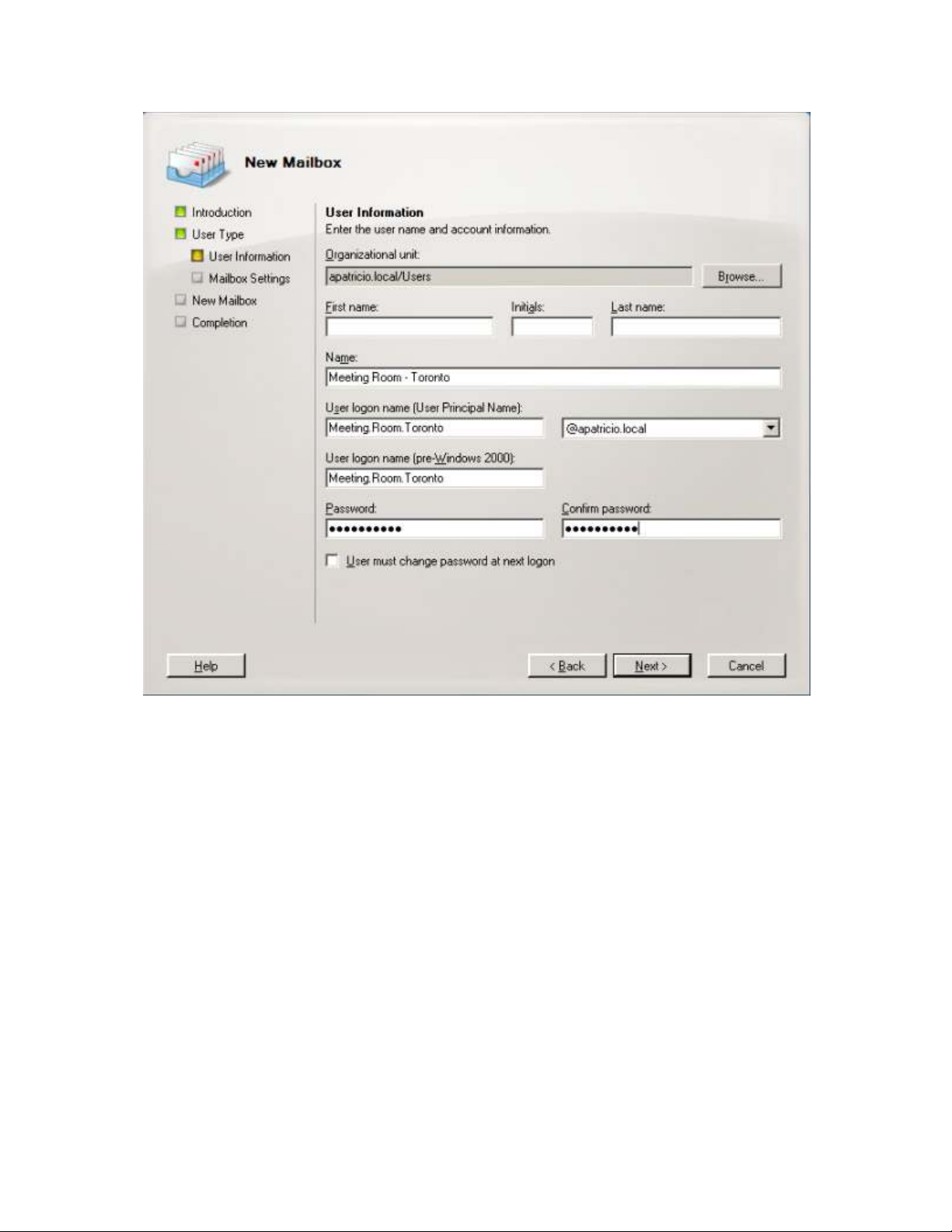 Hình 2: Điền dữ liệu thông tin người dùng Resource mailbox và chọn OU.